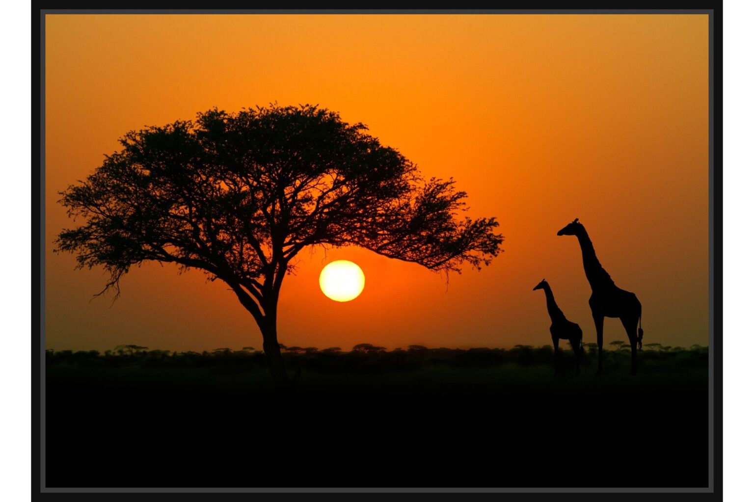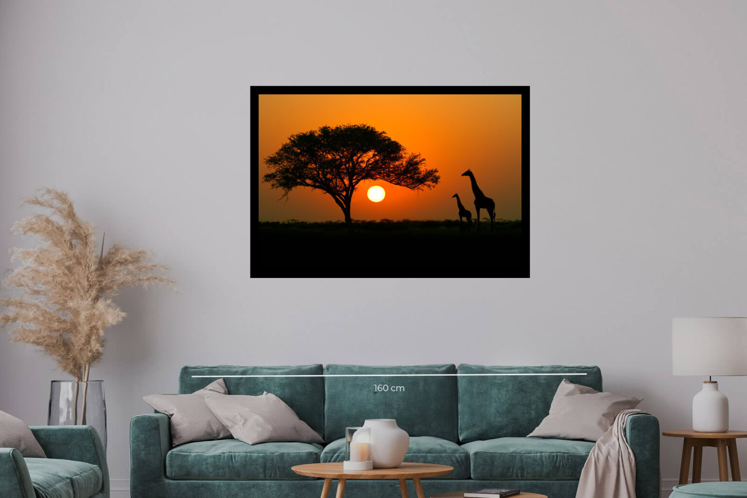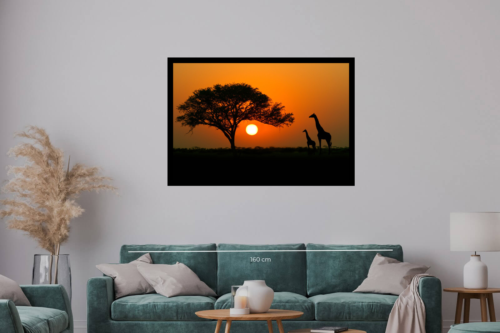 Внушителна фотография на два силуета на жирафи до дърво на фона на оранжев залез. Кадърът съчетава красотата на дивата природа с романтичната атмосфера на африканската савана.