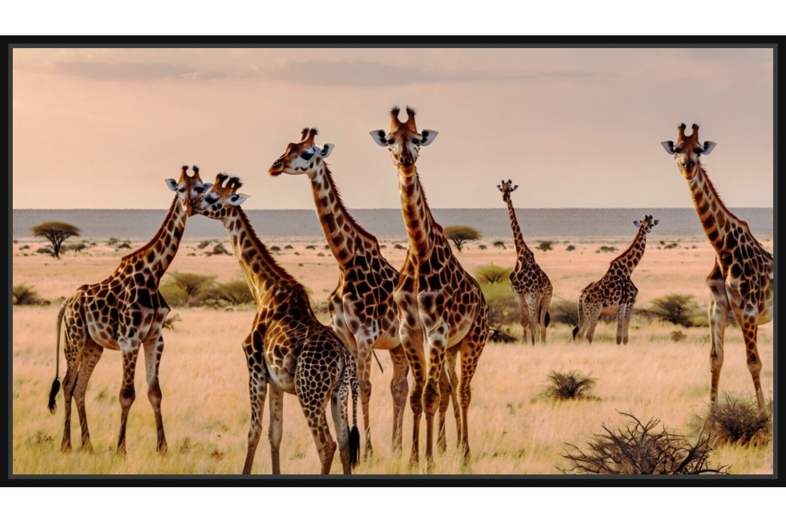 Фотография на група жирафи, събрани сред саваната. Величествените силуети на животните изпъкват на фона на просторния пейзаж и безкрайната линия на хоризонта.