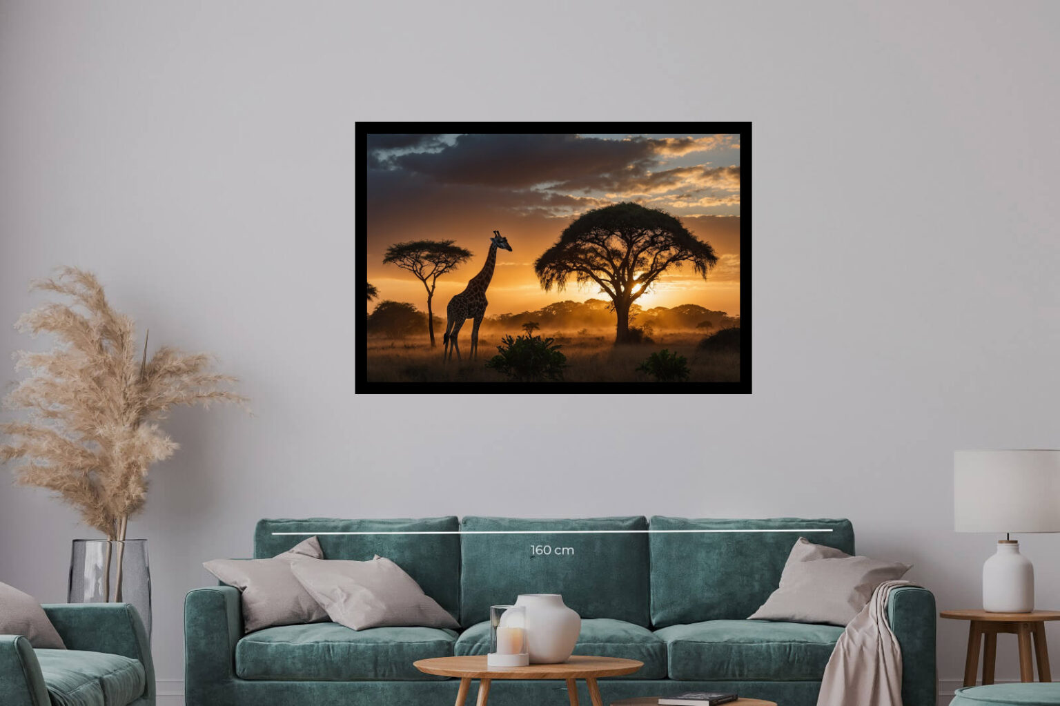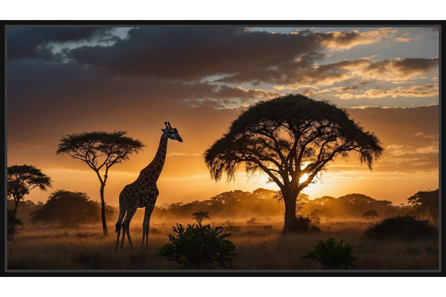Внушителна фотография на жираф сред акации при изгрев. Меката светлина и оранжевите тонове придават топла и магична атмосфера на пейзажа.