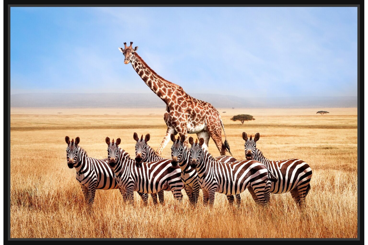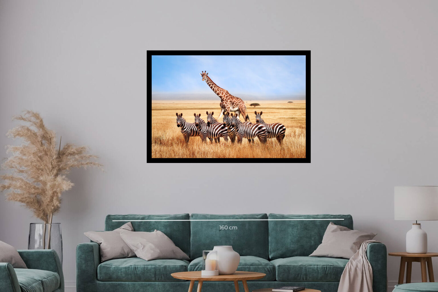 Впечатляваща фотография на жираф и група зебри сред златни треви. Силният контраст между шарките и цветовете създава динамичен и колоритен образ на дивата природа.