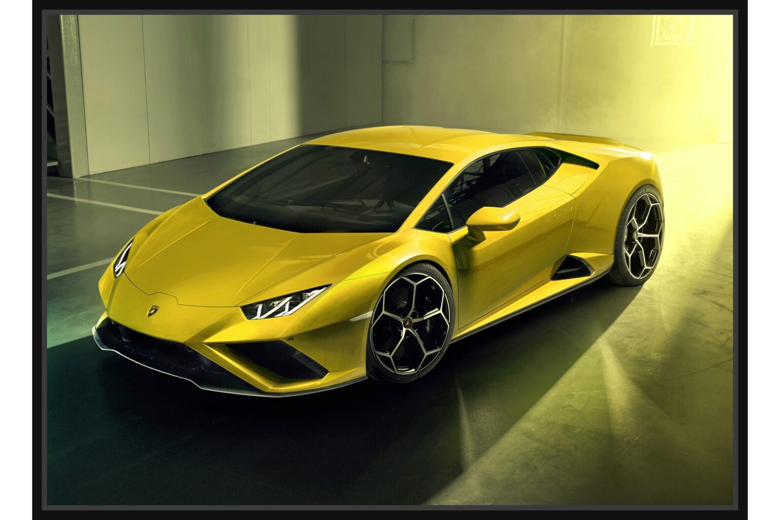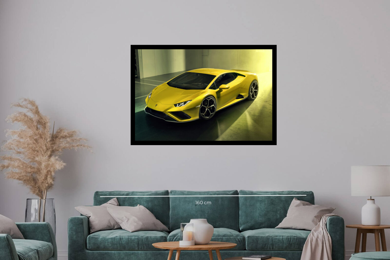 Фотография на жълто Lamborghini Huracán, заснето в интериор с драматично осветление, което подчертава динамичните линии и луксозния му характер. Символ на мощ и елегантност.
