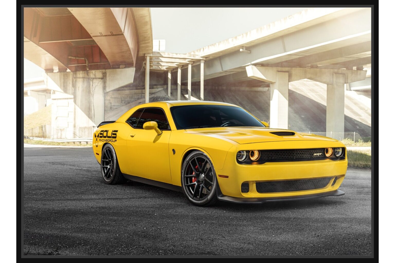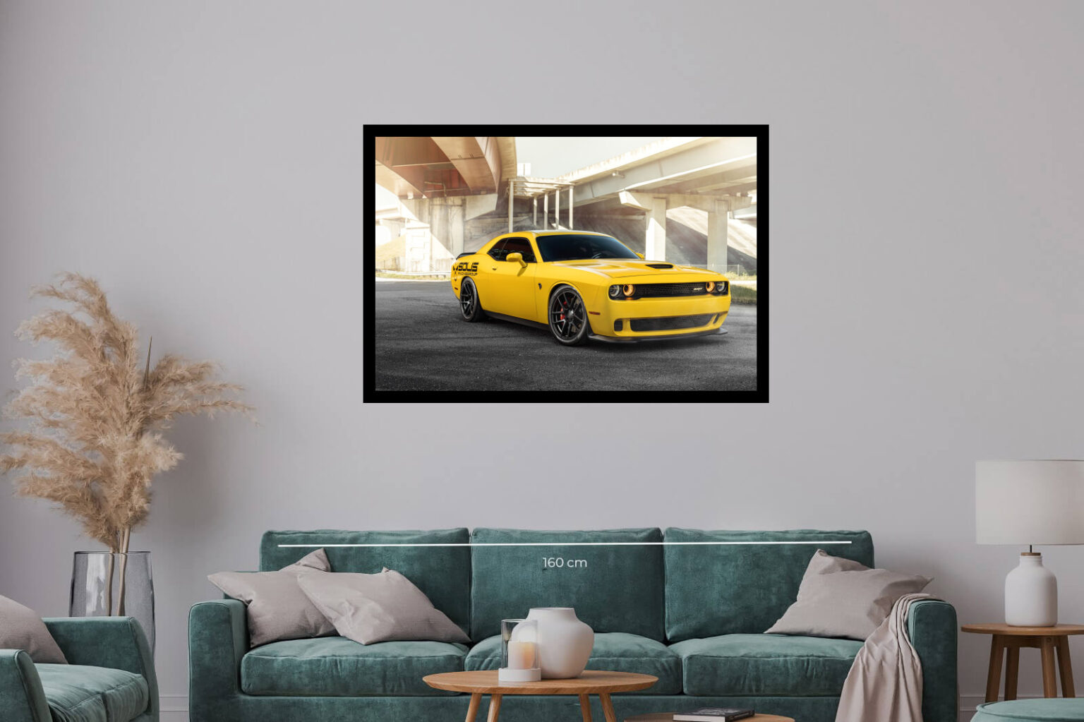 Впечатляваща снимка на ярко жълт Dodge Challenger, паркиран под бетонни мостове, които подчертават мощната му форма и мускулна енергия. Контрастът между агресивния спортен дизайн и сивата градска среда придава усещане за скорост и сила.