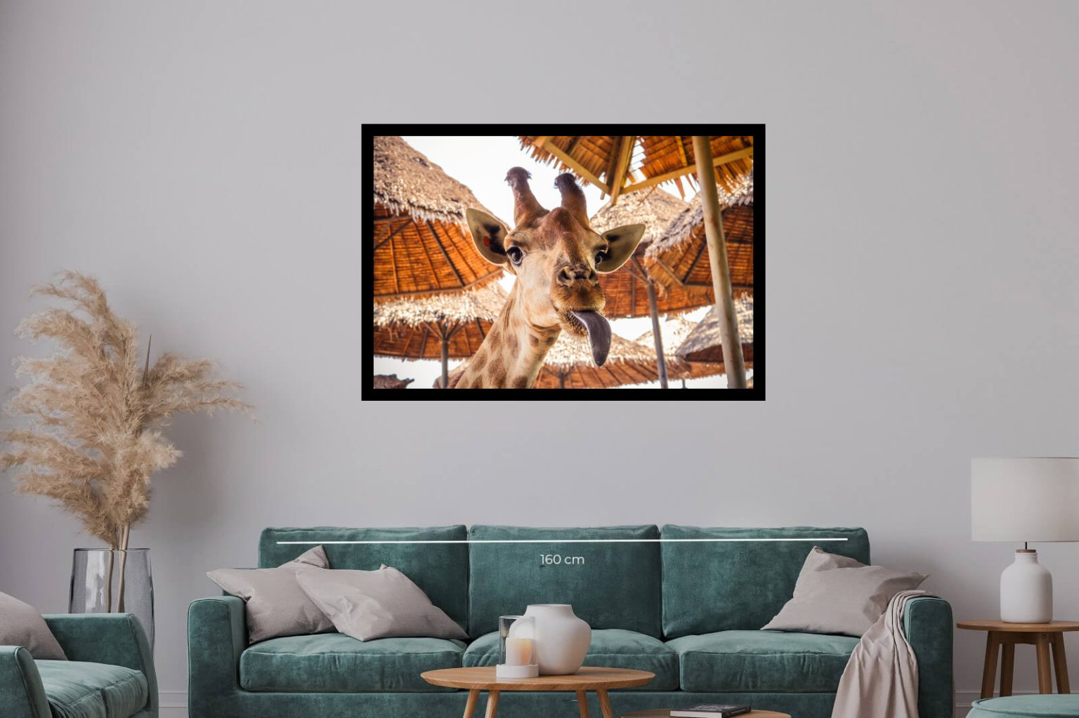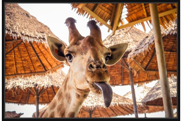 Забавна фотография на жираф, подал език под традиционни африкански покриви. Кадърът улавя игривата и нетипична страна на животното, като внася хумор и чар в колекцията от диви кадри.