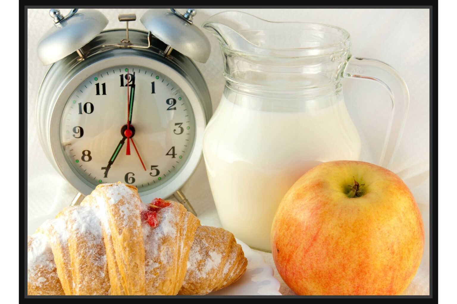 Лека и вкусна закуска с чаша прясно мляко, пухкав кроасан и свежа ябълка. Поднесена в комбинация с ретро будилник – символ на началото на деня със свежест и енергия.