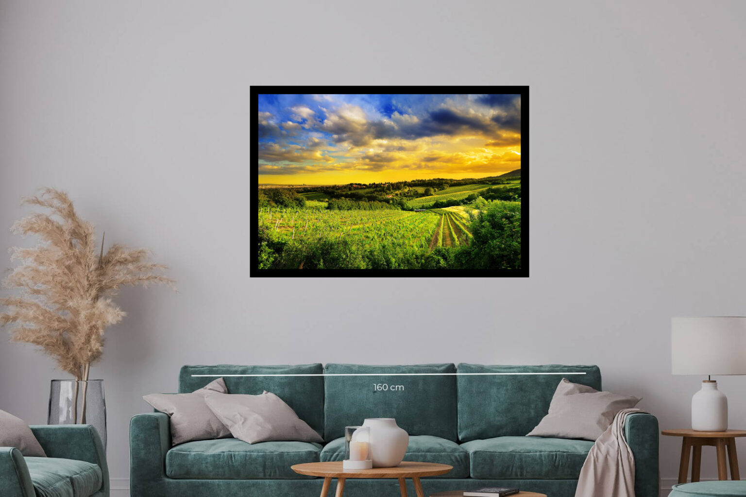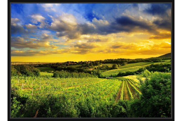 Фотография на лозови масиви, окъпани в светлината на драматичен залез. Златистото небе и облаците подчертават богатството на природата и символизират плодородие и хармония.