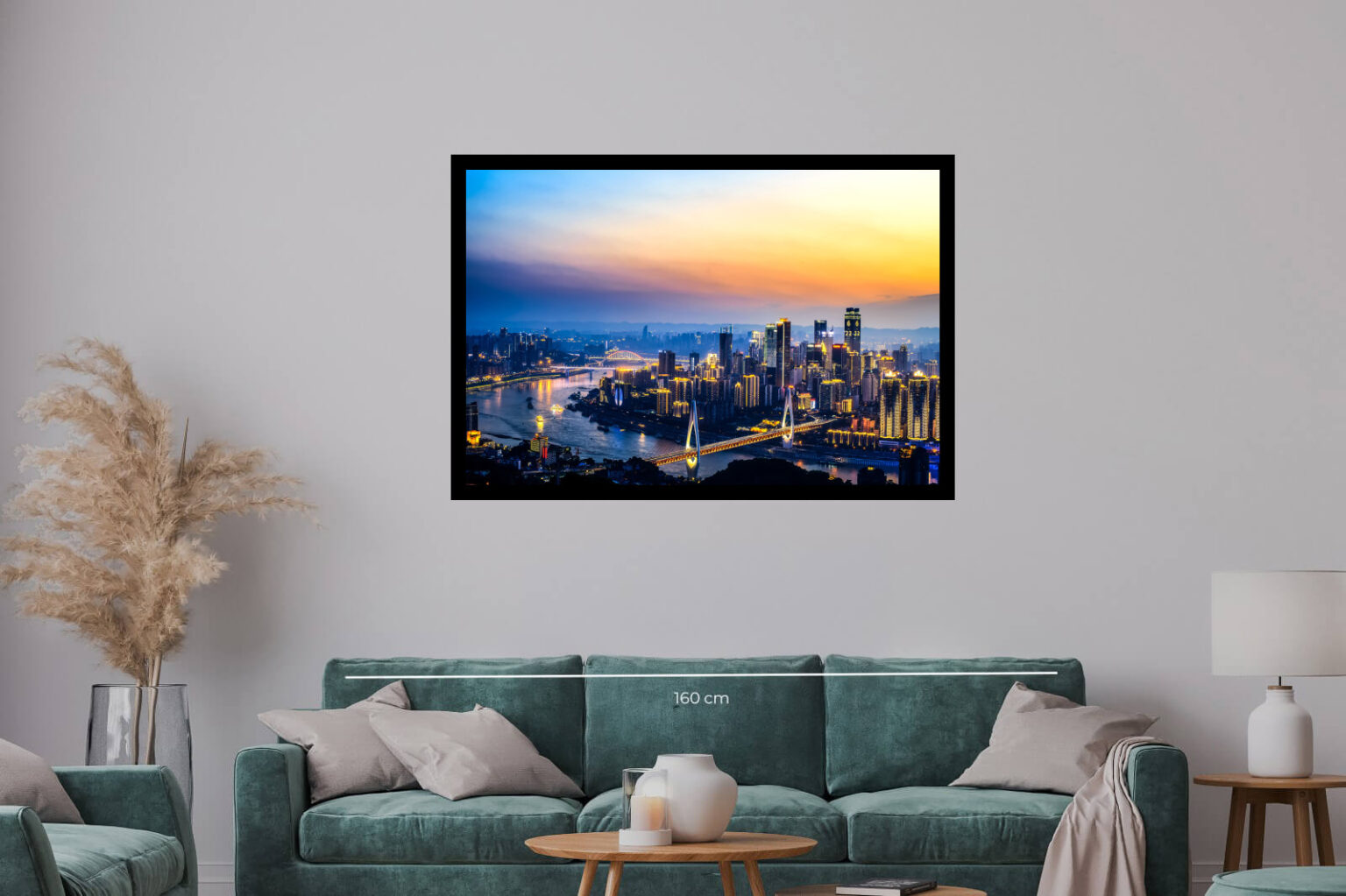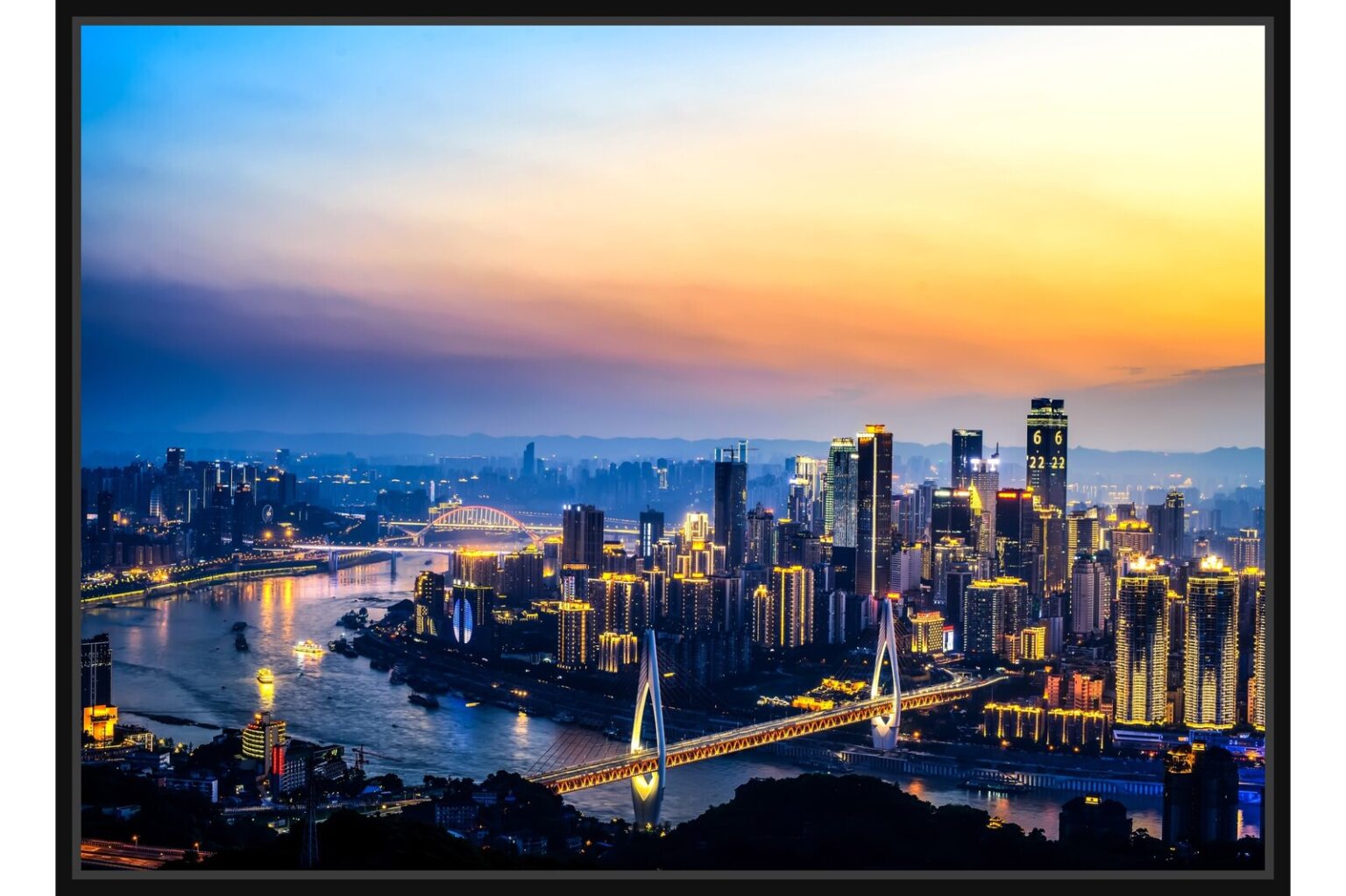 Панорамна гледка към модерен град при залез, с блестящи небостъргачи и осветен мост над река. Атмосферата е динамична и съчетава естествена красота и урбанистична архитектура.