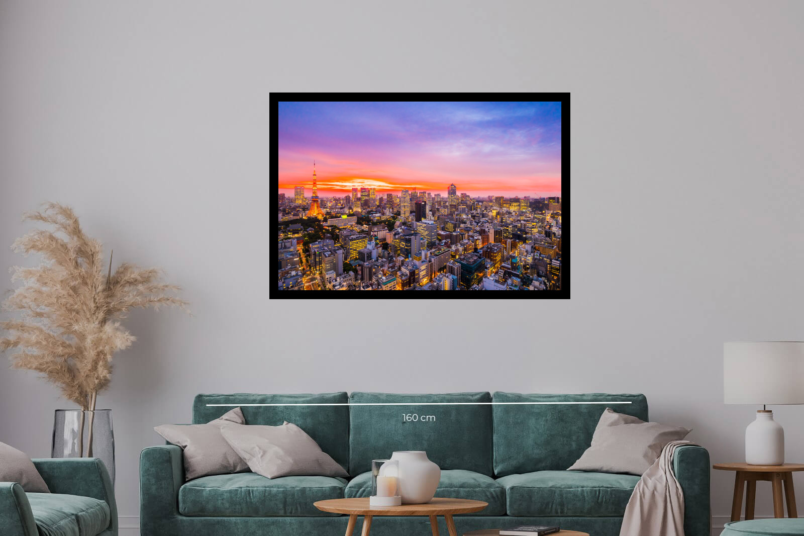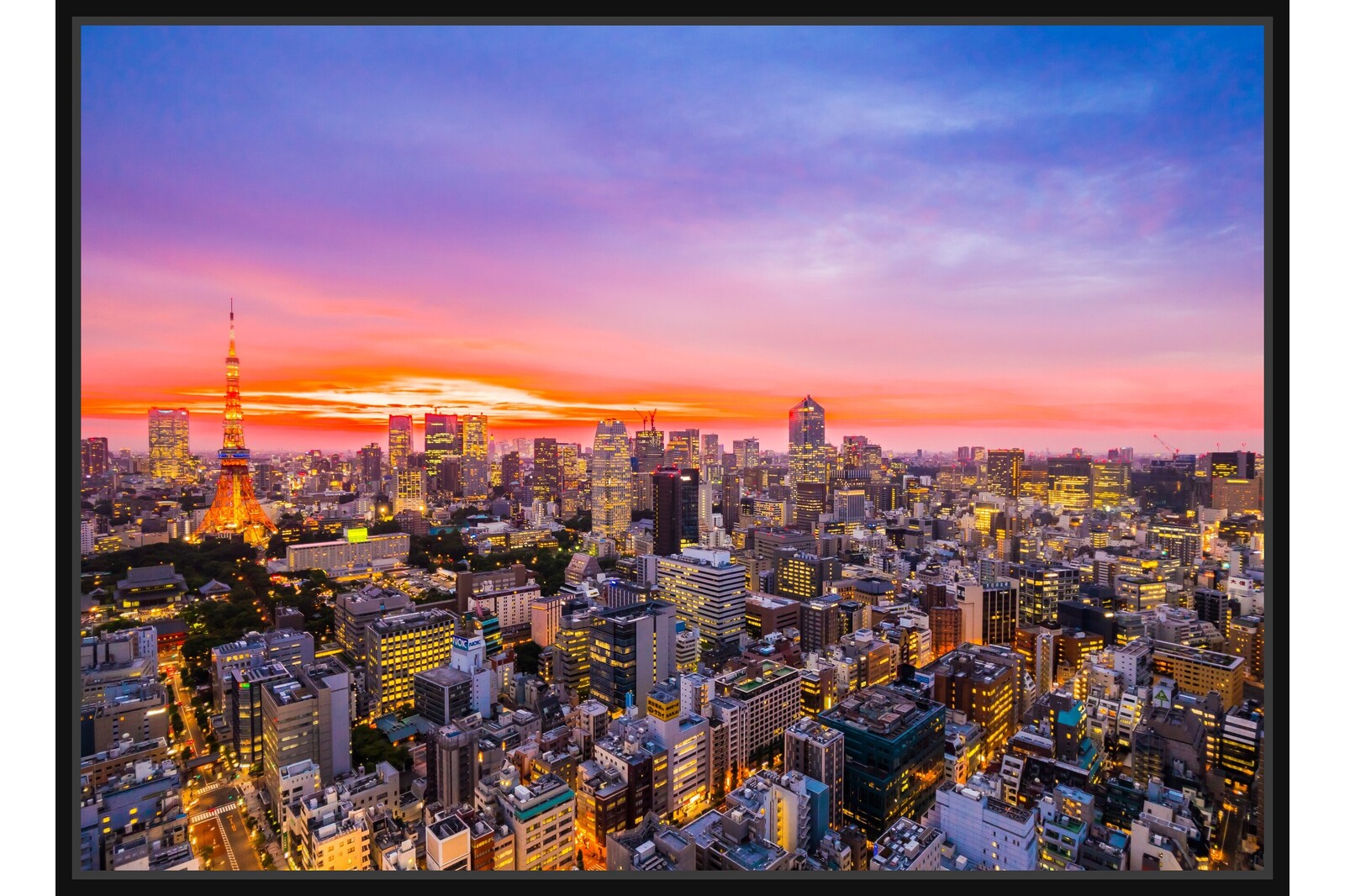 Панорамна фотография на Токио по време на залез, с ярки цветове в небето и светещи сгради. Снимката улавя динамиката на японската столица и контраста между традиция и модерност.