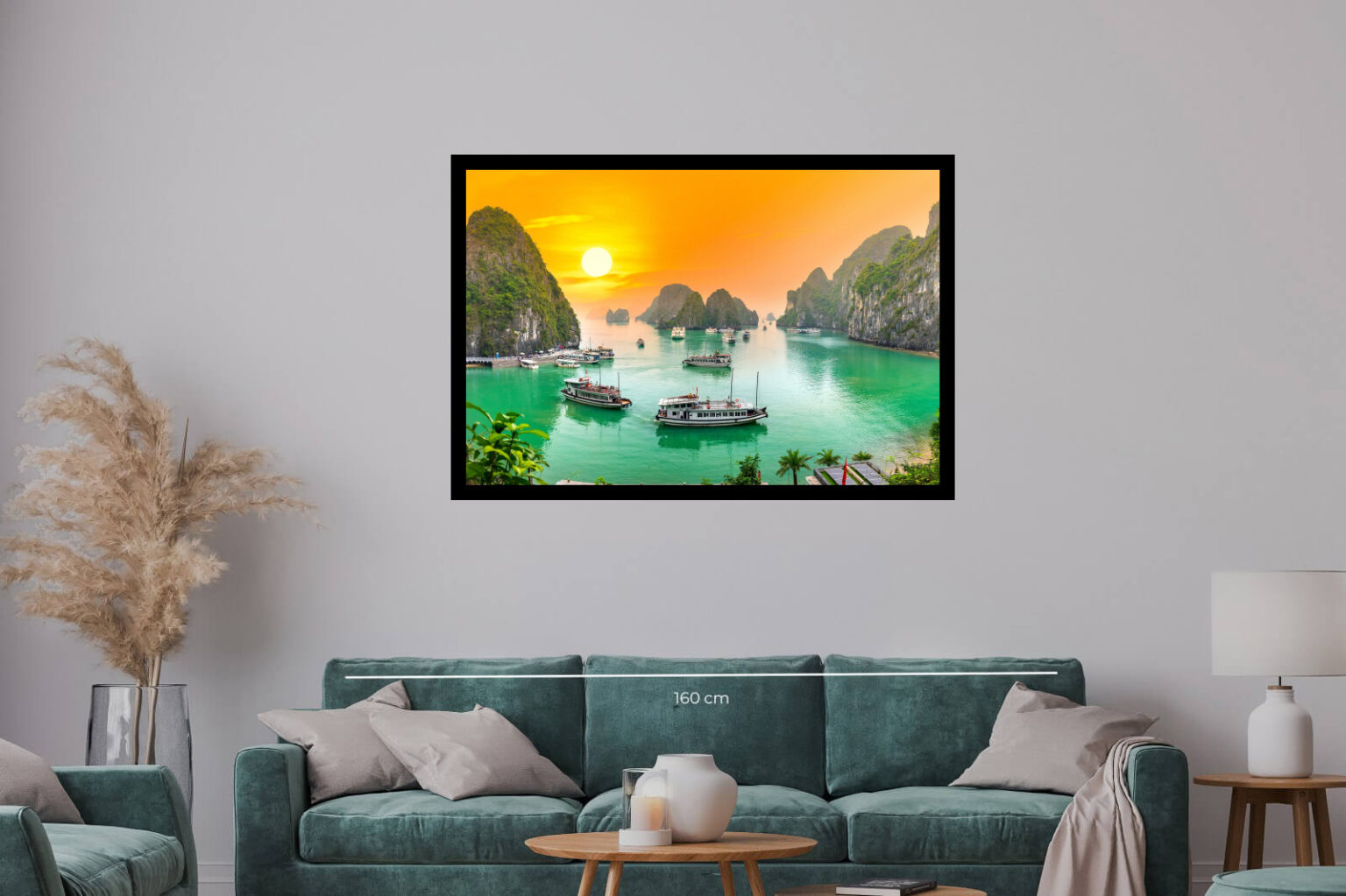 Живописен залез над Халонг Бей с ярко оранжево небе, зелени варовикови острови и лодки по водата. Сцена на хармония и красота.