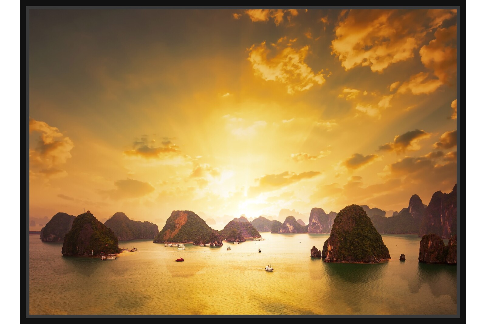 Впечатляващ залез над Халонг Бей във Виетнам, с варовикови острови и златисто небе. Атмосферата е романтична и величествена.