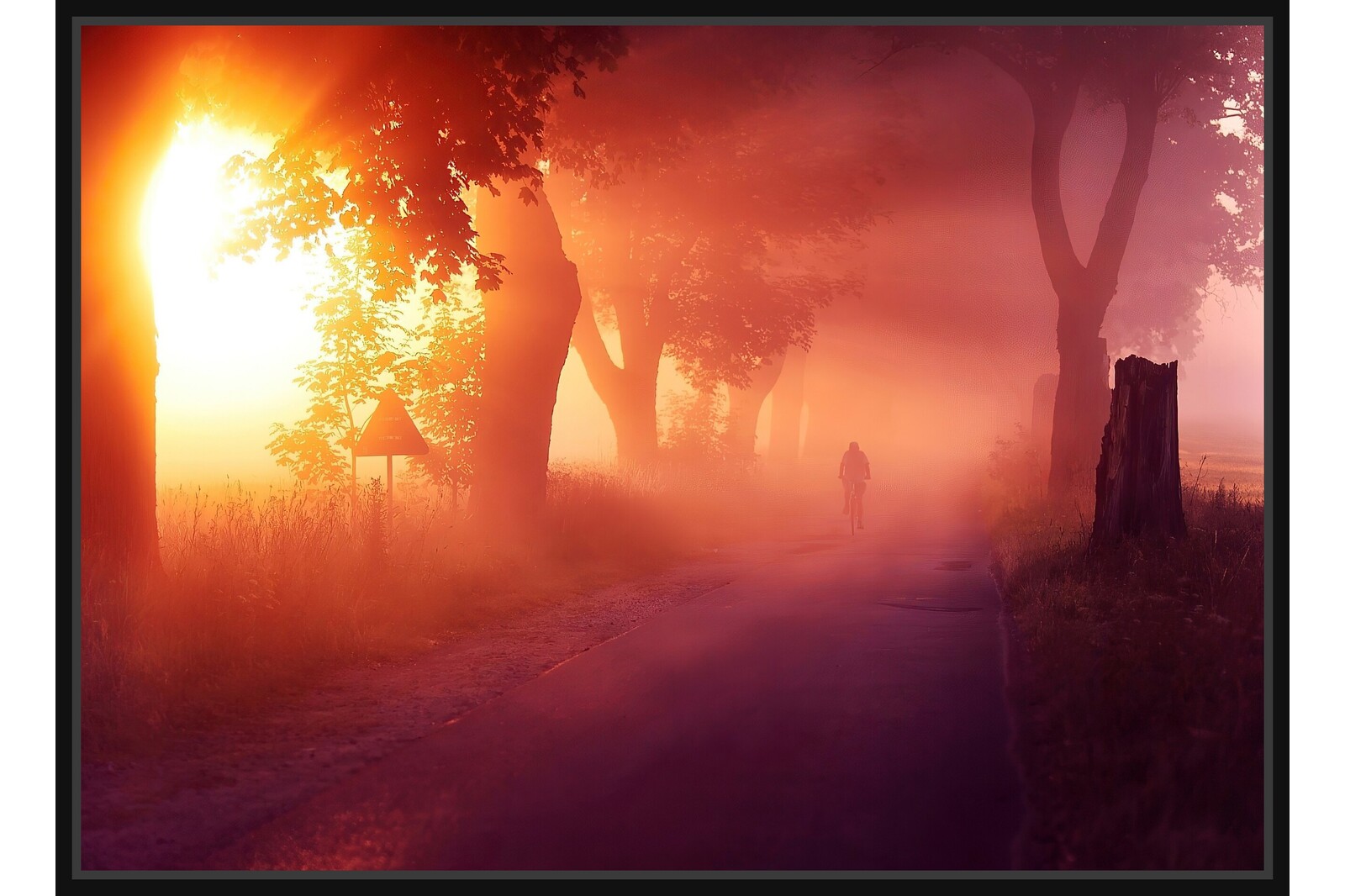 Залязващото слънце осветява горски път в наситени червено-оранжеви нюанси. Силует на колоездач добавя усещане за движение и романтична атмосфера.