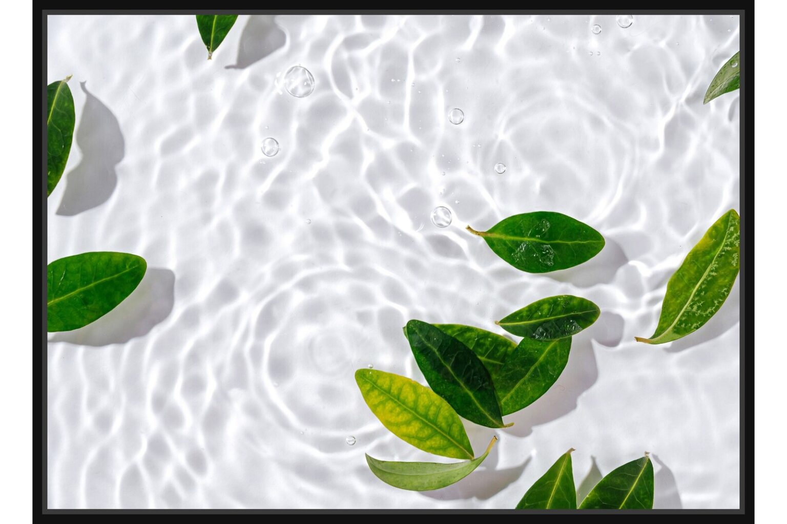 Свежи зелени листа, плаващи върху прозрачна вода с нежни вълни и отблясъци.