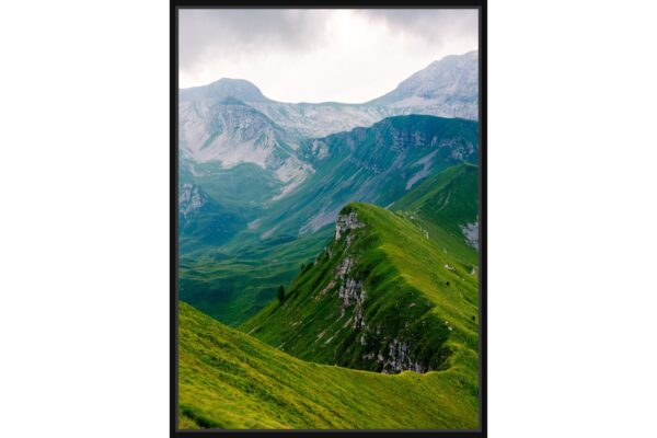 Фотография на зелени планински хълмове, издигащи се под облачно небе. Слоевете от планини в далечината създават усещане за дълбочина и величие.