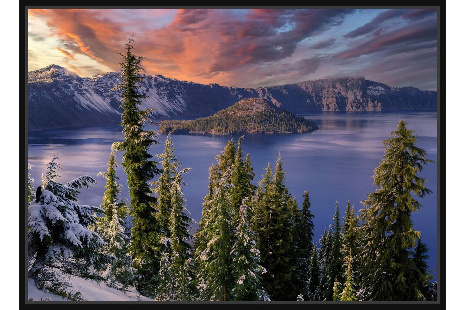 Зимен пейзаж с величествено кратерно езеро, заобиколено от заснежени борове и планини. Небето е оцветено в драматични розово-виолетови тонове при залез.