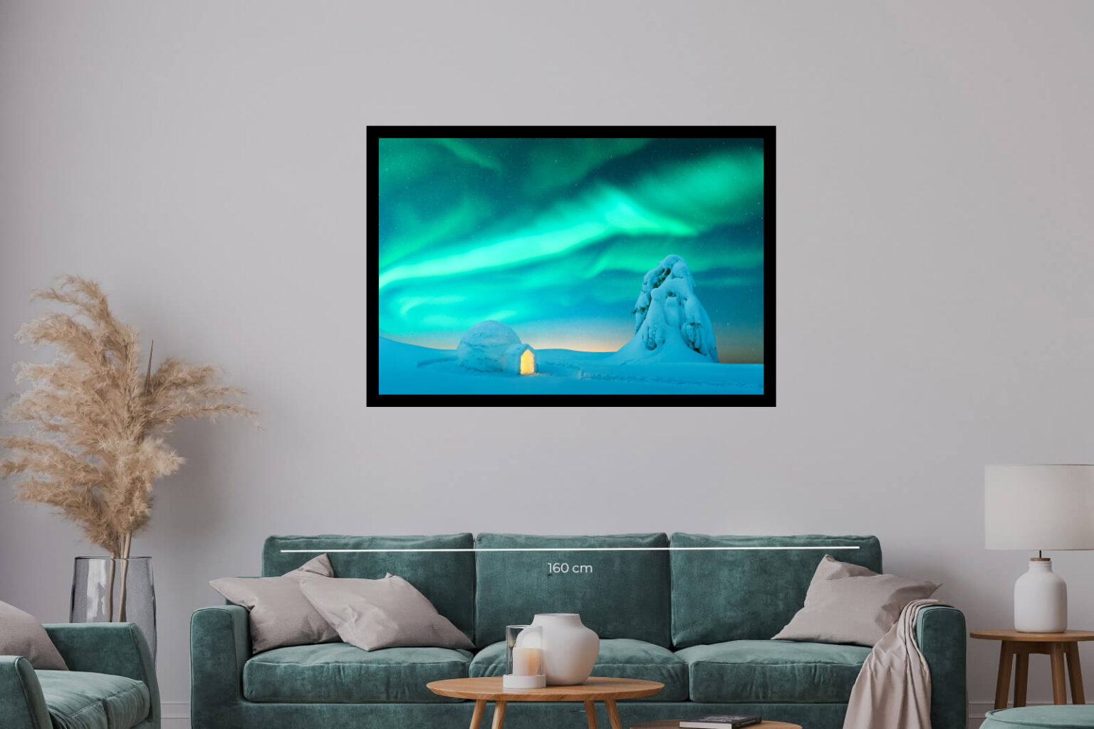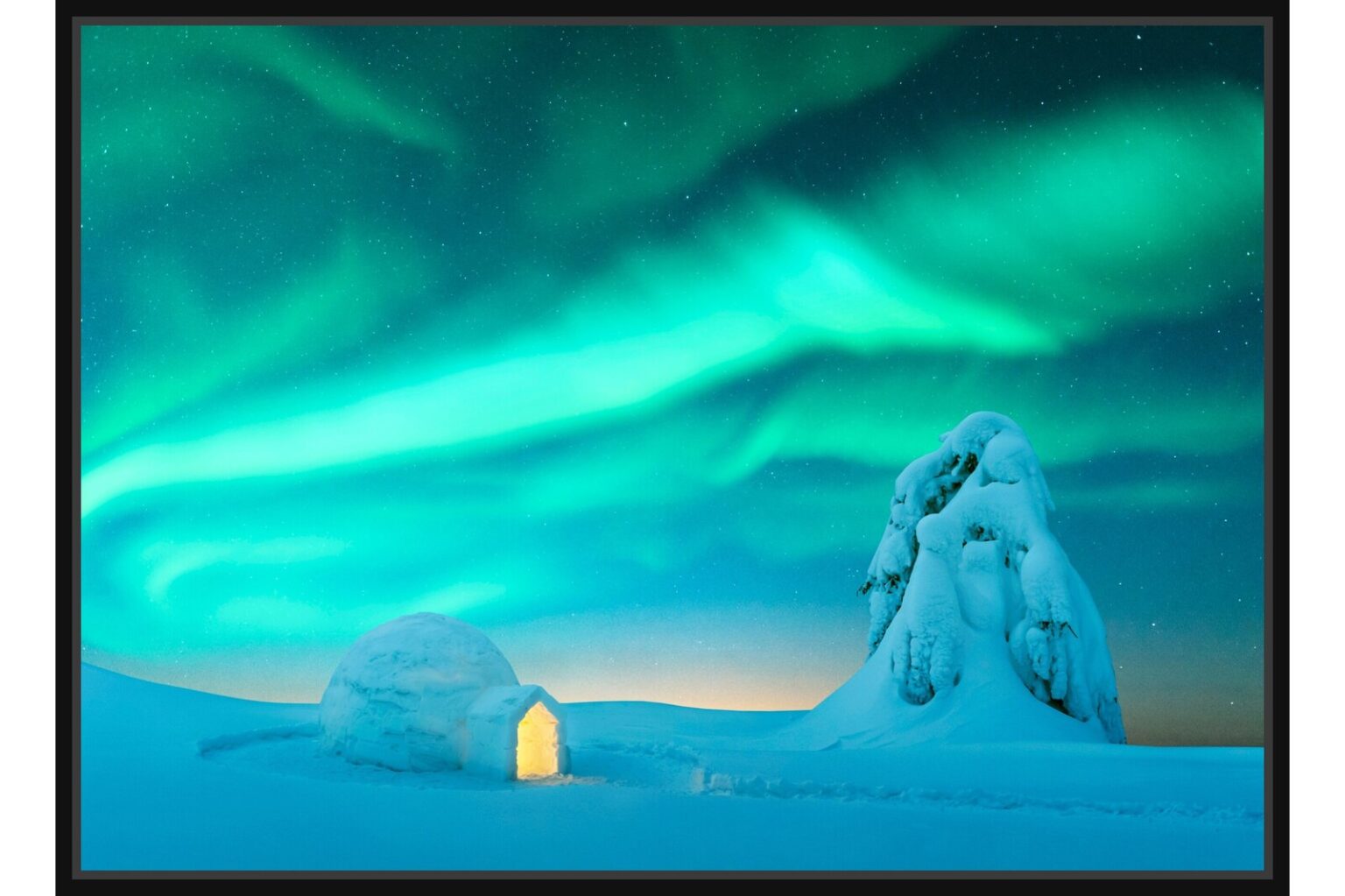 Снежна сцена с иглу и заснежени дървета, облени от сияещите зелени вълни на северното сияние. Атмосферна и мистична гледка.