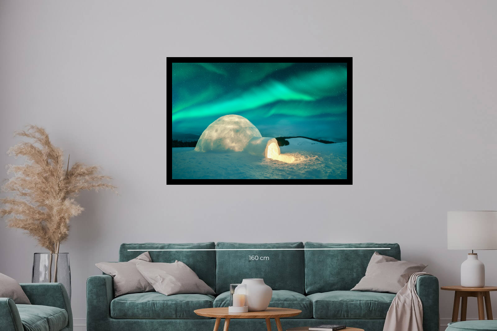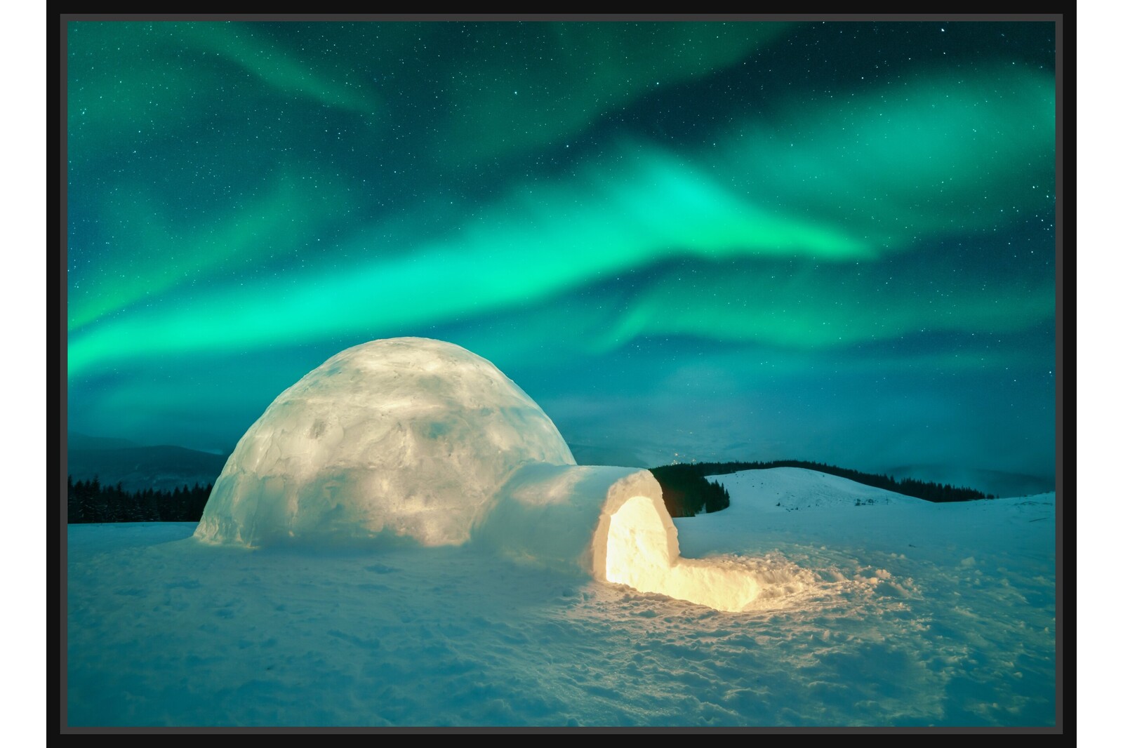 Светещо иглу под завесите на северното сияние в арктическа зимна нощ. Уникално съчетание на природа и традиционна архитектура от лед.