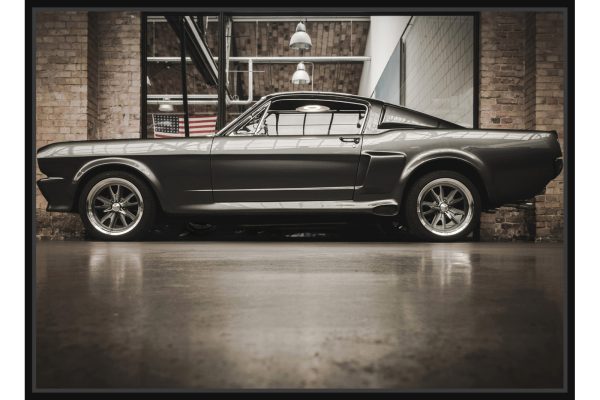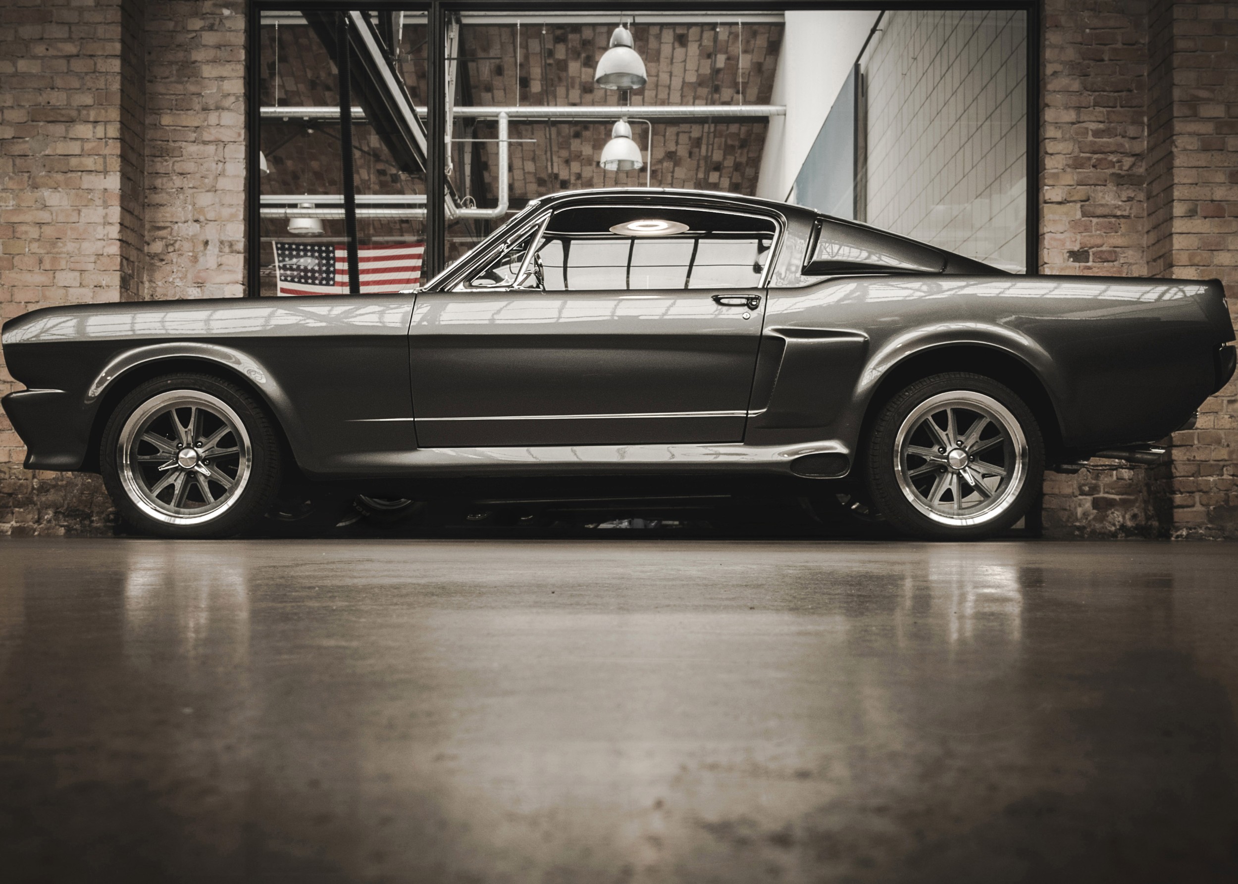Фотография на сив класически автомобил в индустриална обстановка. Светлината и тухлената стена подчертават елегантния дизайн и стил на колата.
