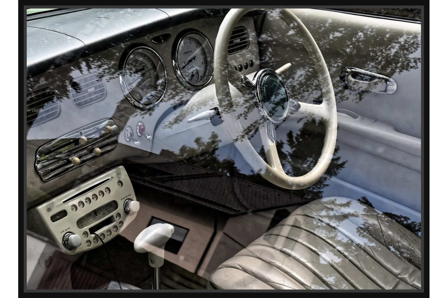 Интериор на ретро автомобил, заснет през прозореца, с бяло кормило, класически уреди и тапицерия в светли тонове. Изображението носи усещане за носталгия и финес, вплетено в отраженията на околната среда върху стъклото.