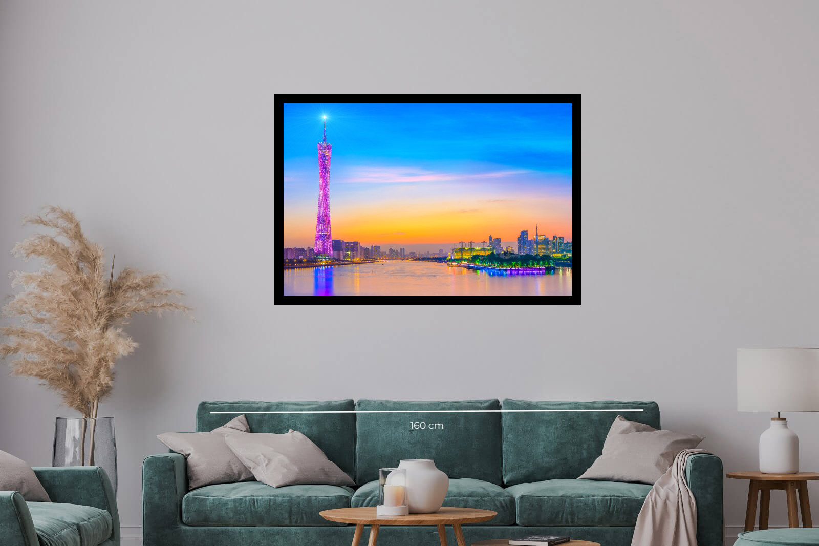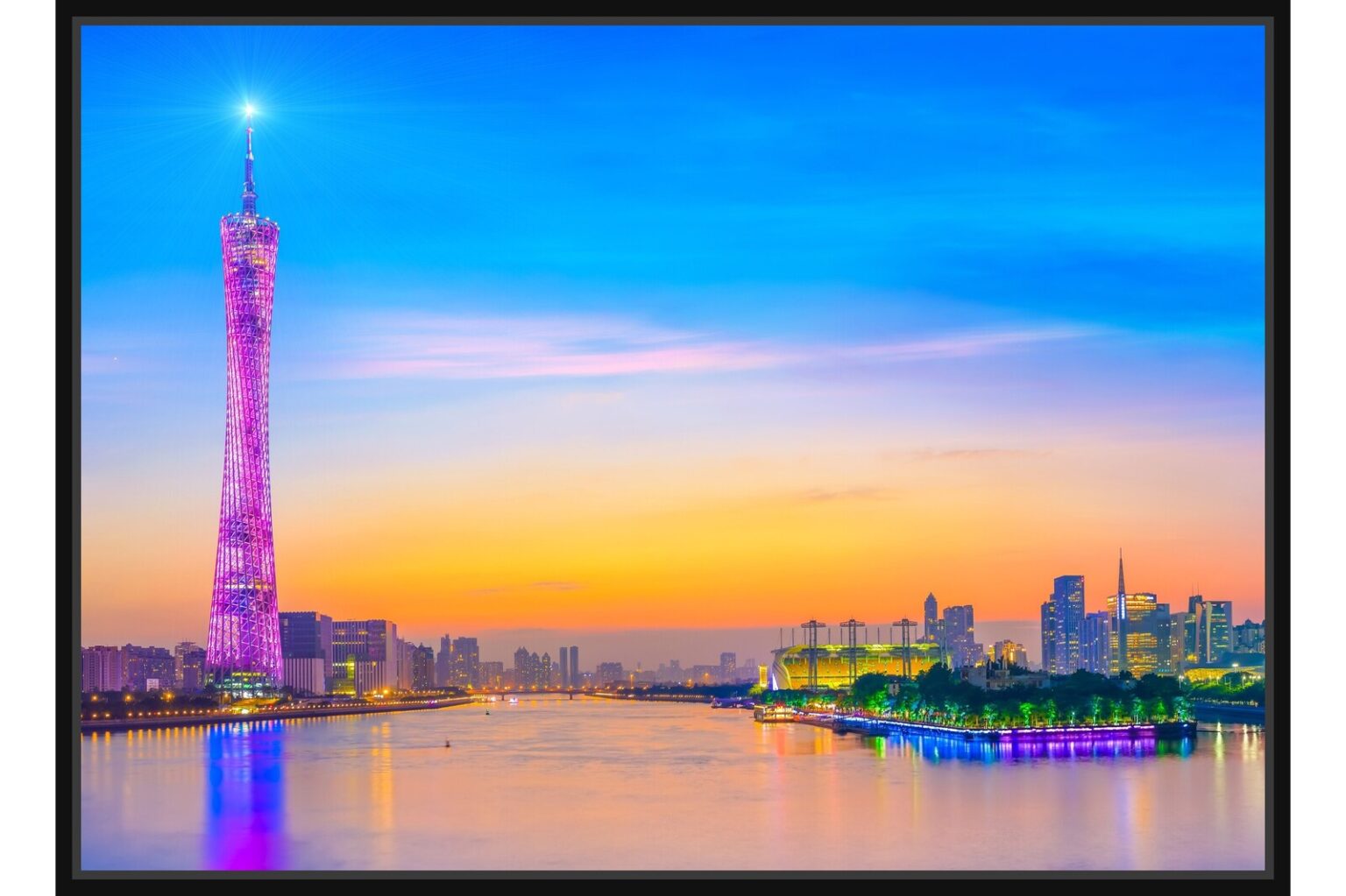 Фотография на известната Кантонска кула в Гуанджоу, осветена в ярки цветове по залез. Съвременната архитектура и отразената светлина в реката създават впечатляваща градска визия. Подходящо за модерни интериори, които търсят динамика и блясък.