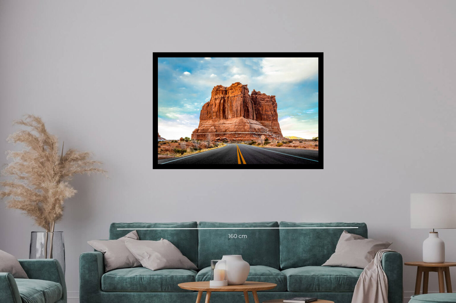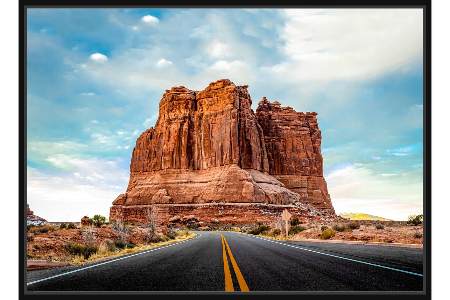 Път, който води към огромна червена скала в пустинен каньон. Контраст между величествената природа и човешкия път през нея.