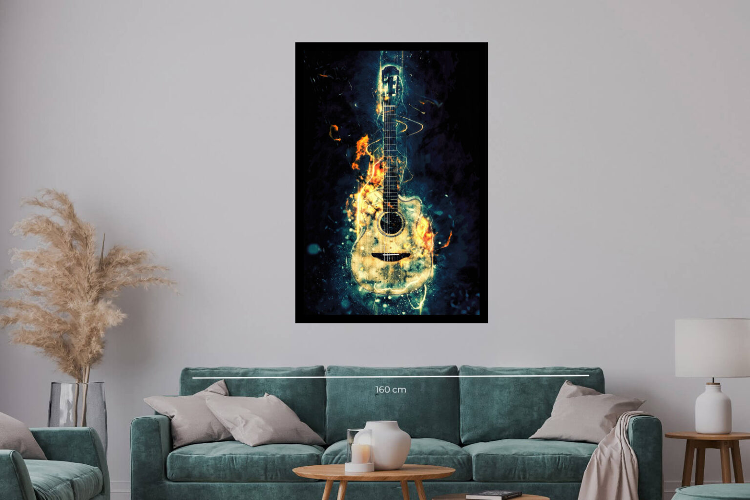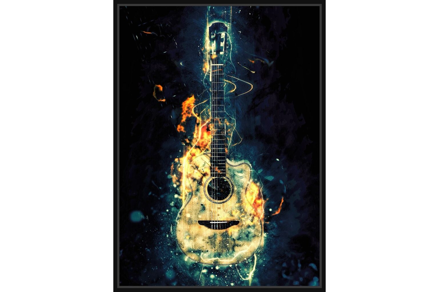 Дигитална арт фотография на китара, изобразена сякаш гори в пламъци и светлинни ефекти. Енергично и експресивно изображение, което символизира страстта към музиката и силата на изкуството. Подходящо за модерни и динамични интериори.