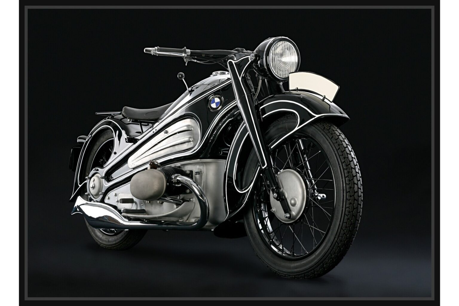 Иконичен мотоциклет BMW, представен в черно и сребро, заснет на черен фон. Този кадър подчертава елегантния и силует и инженерната прецизност, които превръщат модела в истинска класика.