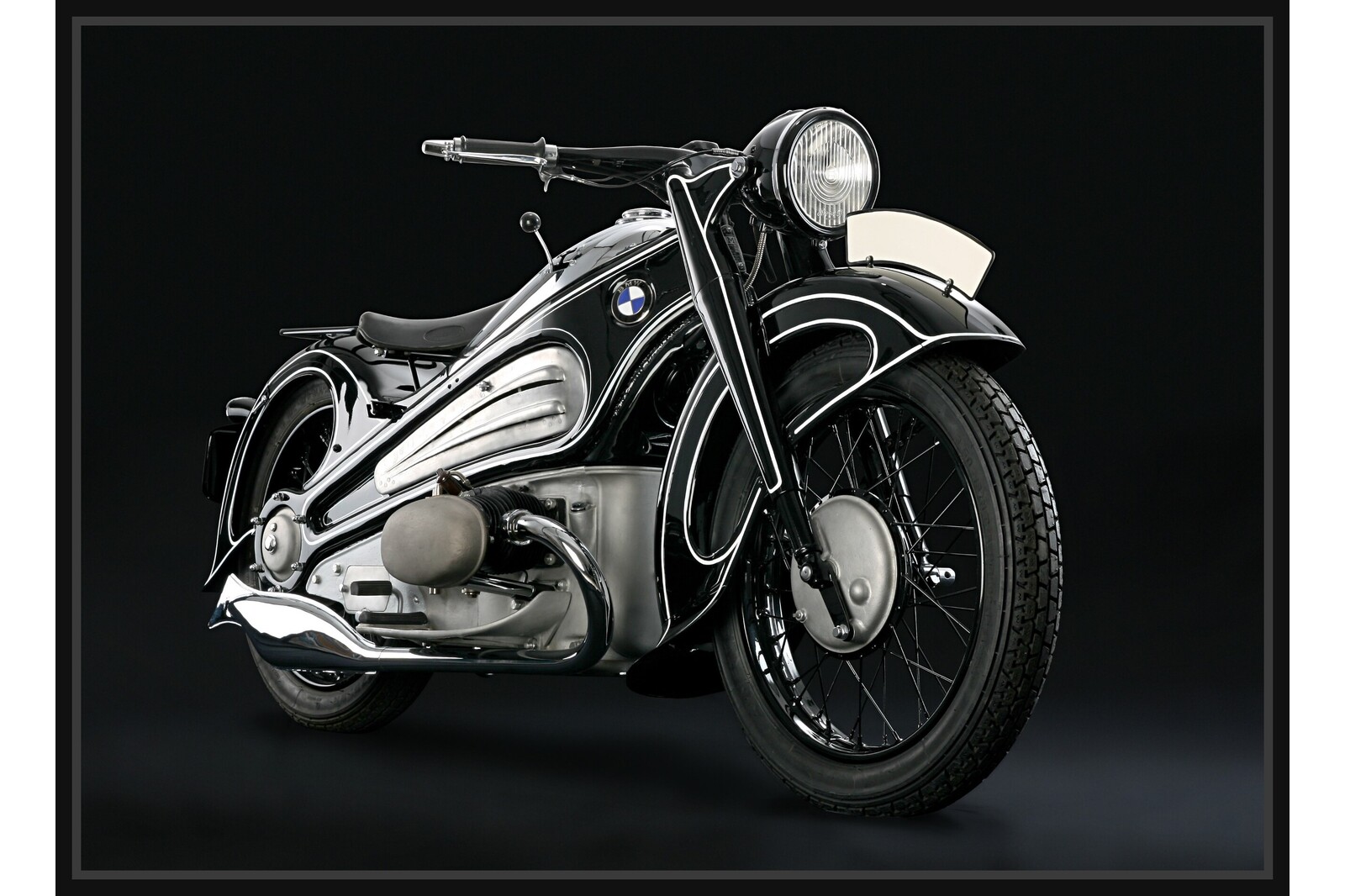 Класически мотоциклет BMW в черно и сребро на черен фон