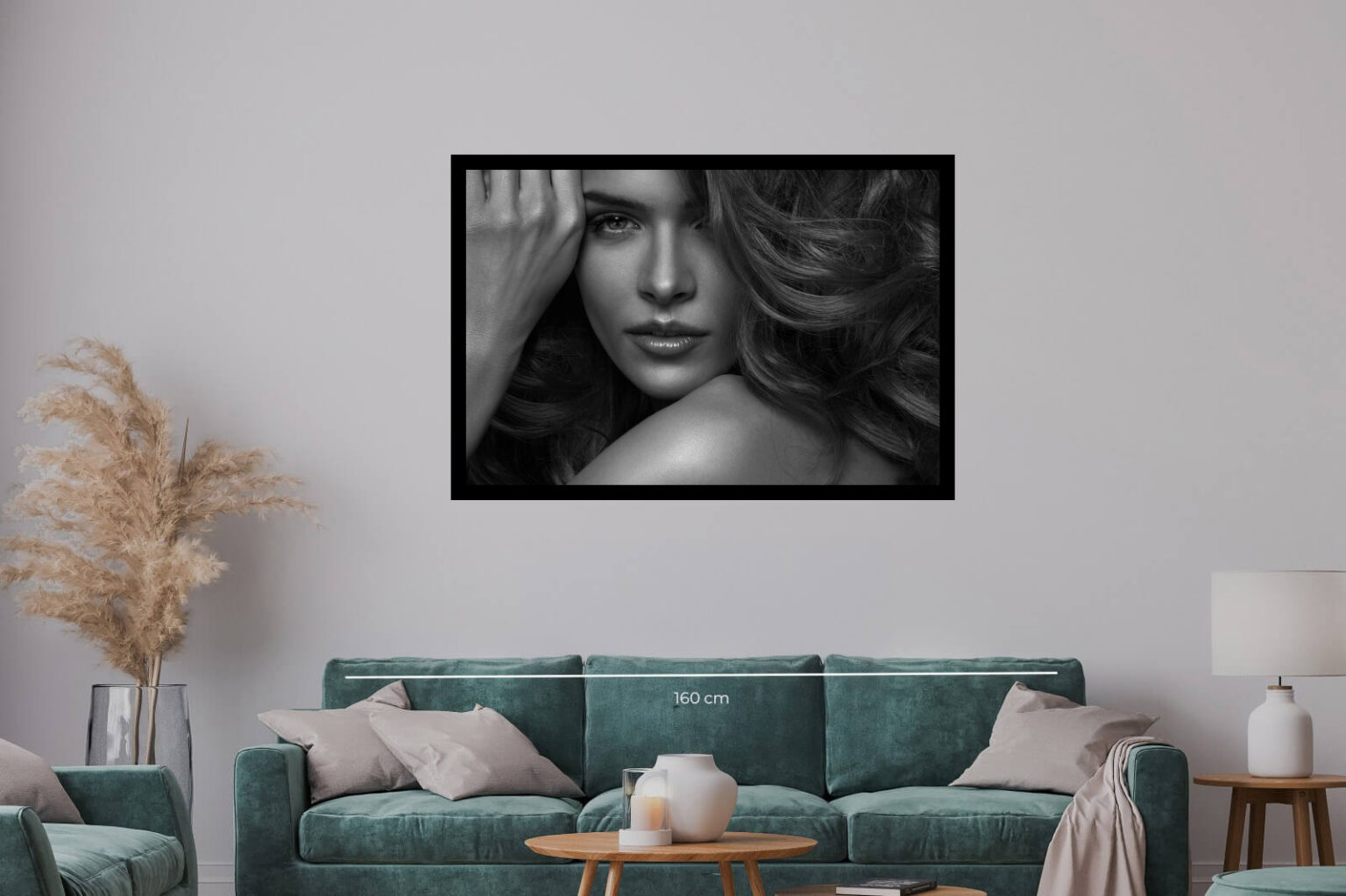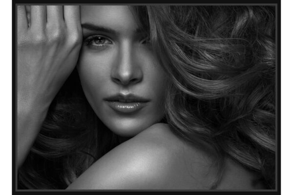 Класически женски портрет в черно-бяло, подчертаващ изразителен поглед и меко падащи сенки по лицето. Фотографията е балансирана и стилна, с артистичен акцент върху естествената красота.