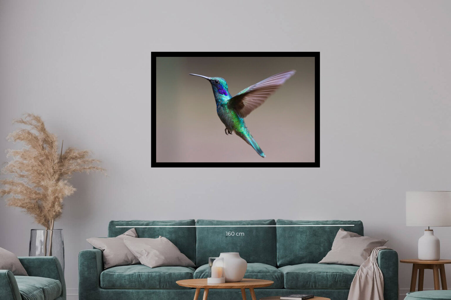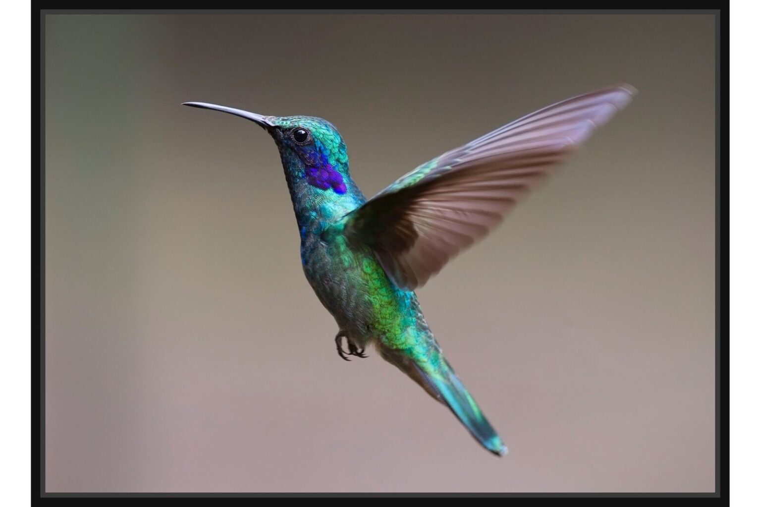 Изящна фотография на колибри в полет, чиито пера блестят в зелено, синьо и лилаво. Нежният размазан фон подчертава финеса на птицата и създава усещане за лекота и движение. Кадър, който улавя красотата и хармонията на природата.
