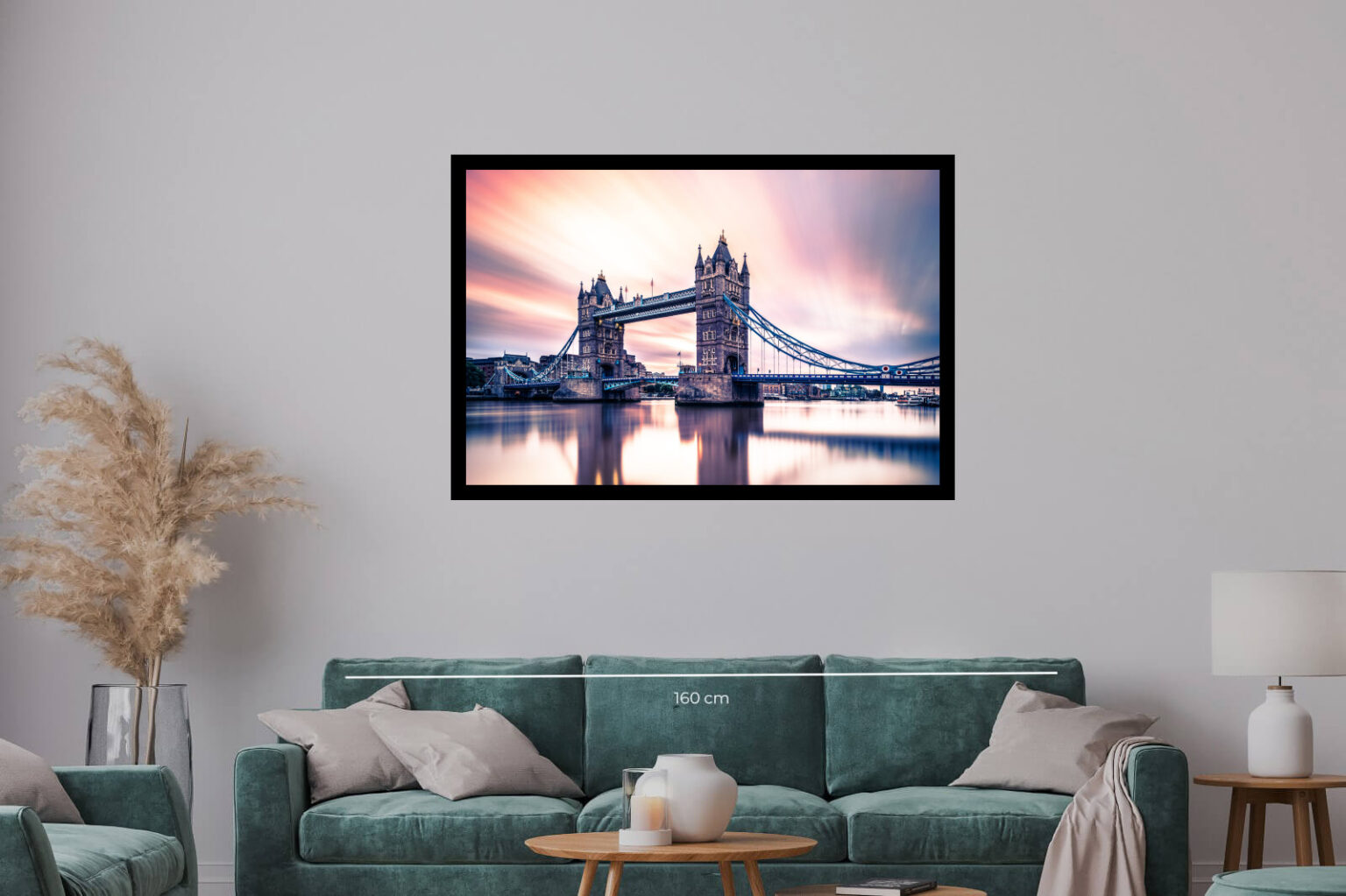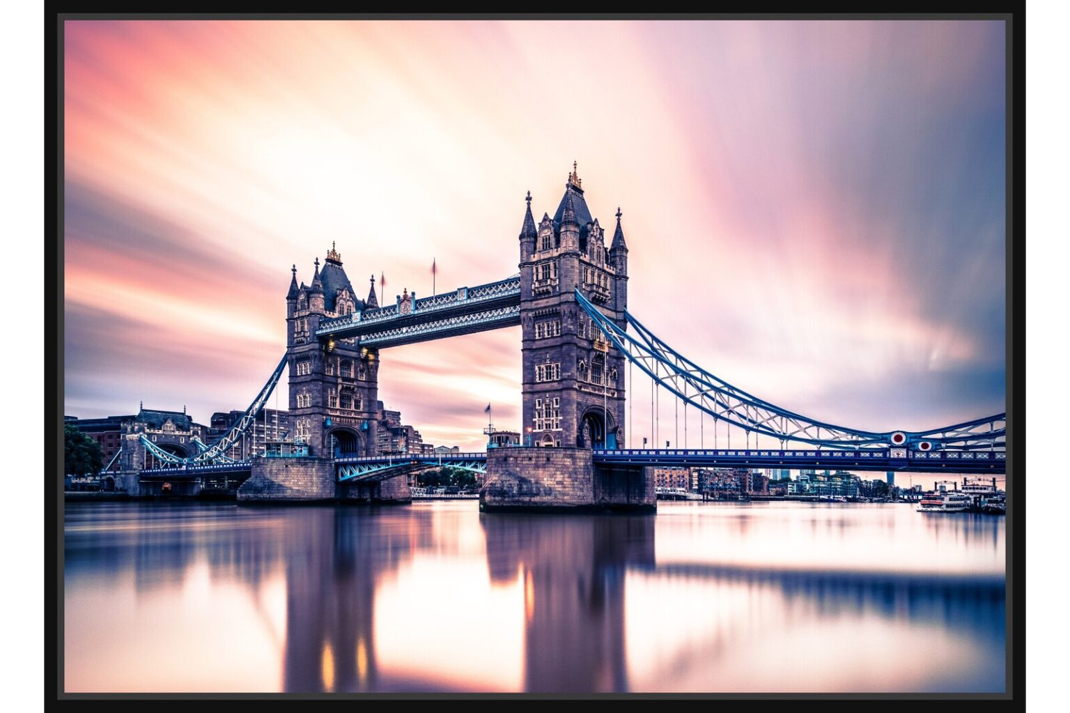 Артистична снимка на Лондон Бридж по залез, с меко осветление и драматично небе.