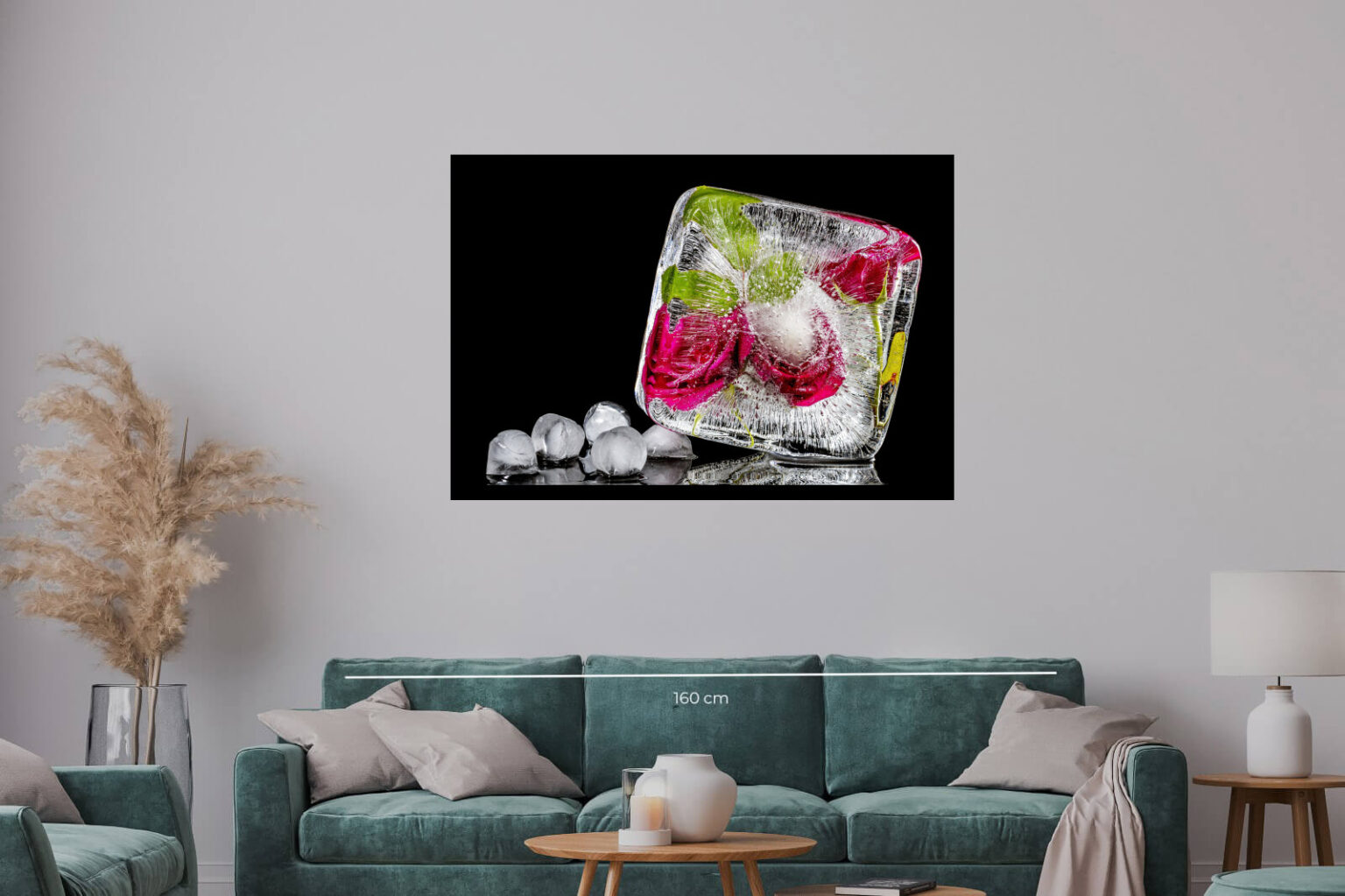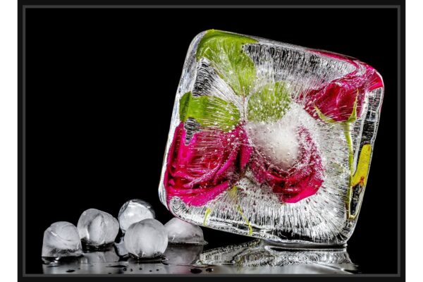 Художествена фотография на ледено блокче с вградени рози, заснета върху черен фон. Контрастът между леда и цветята създава усещане за елегантност и свежест.
