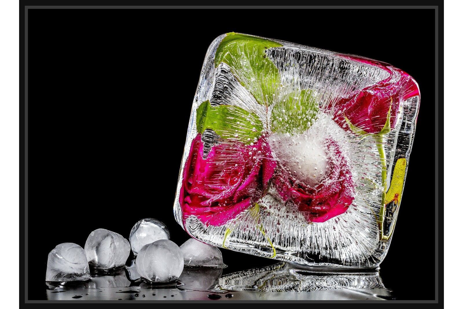 Ледено блокче с рози върху черен фон.