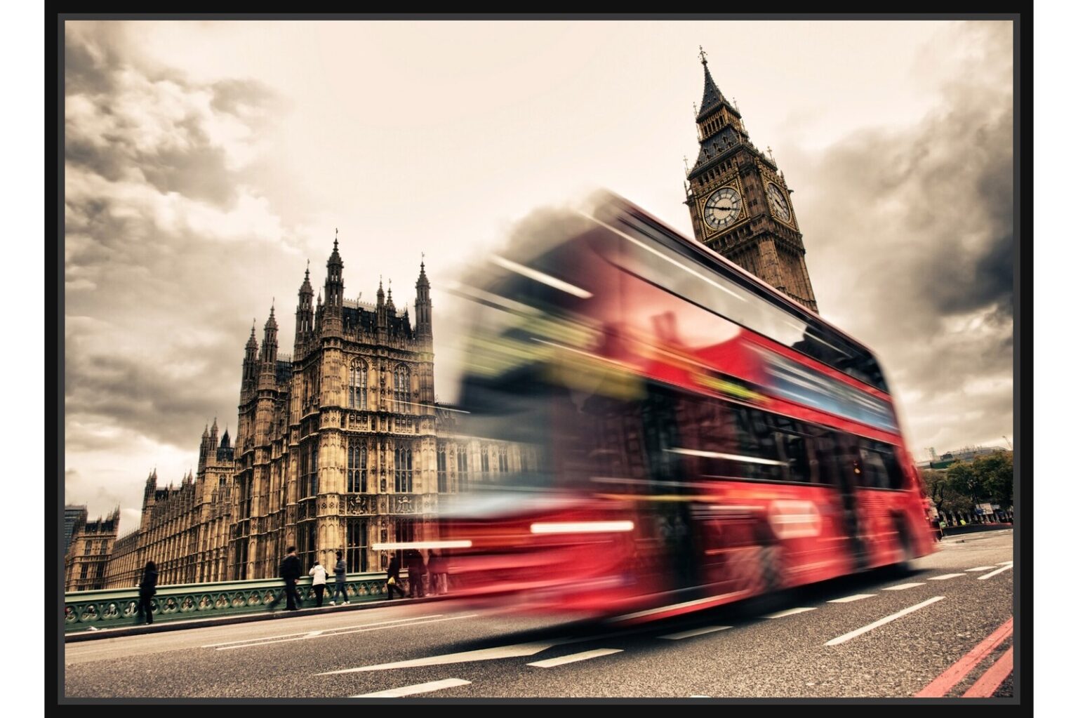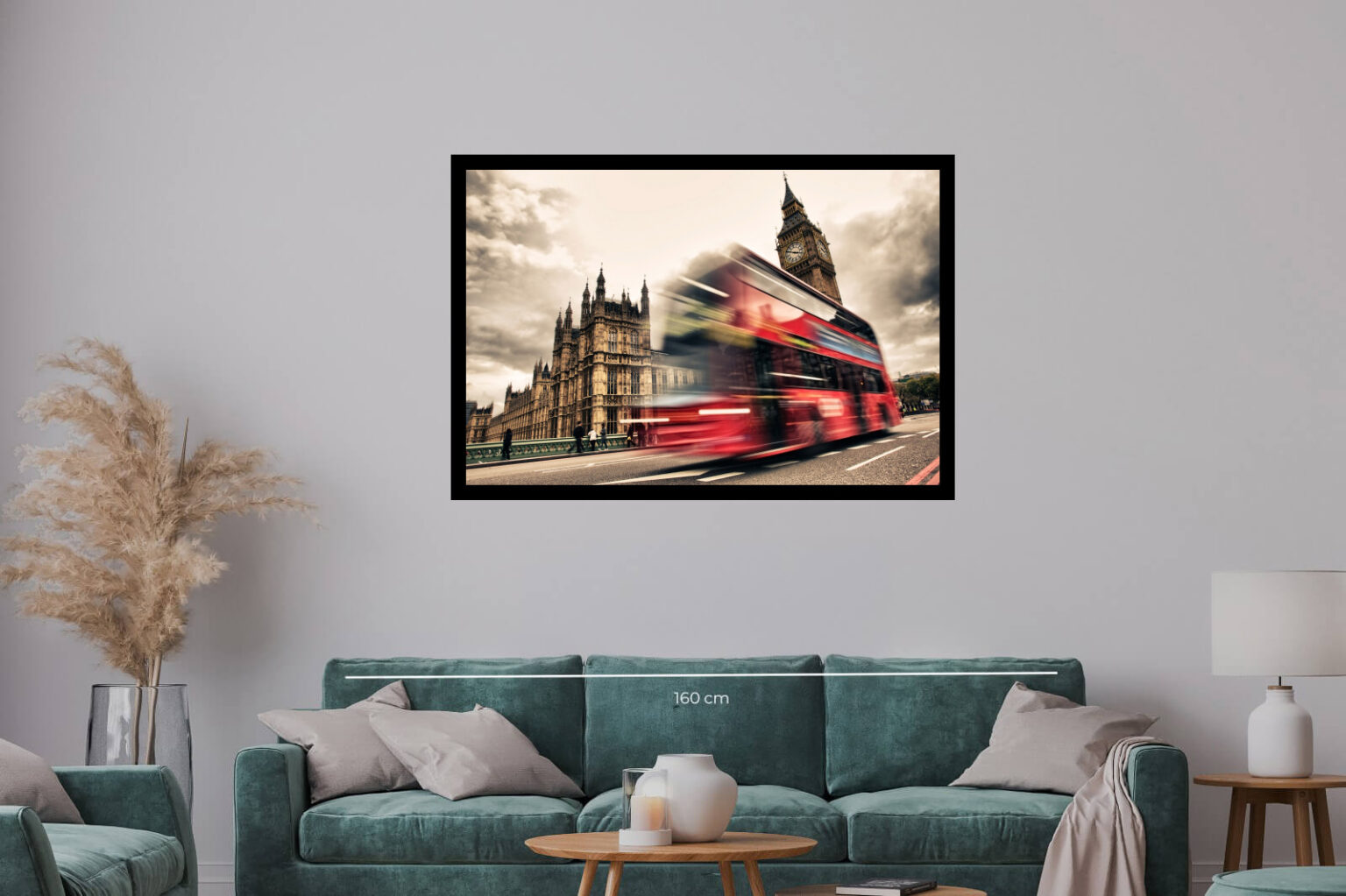 Динамична фотография на класическия червен автобус в движение пред Биг Бен. Снимката символизира пулсиращата енергия на Лондон, съчетавайки традиция и съвременност.