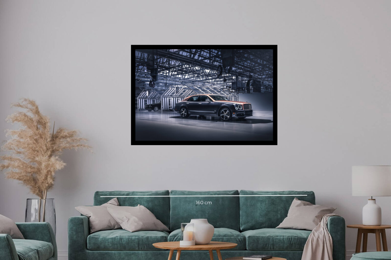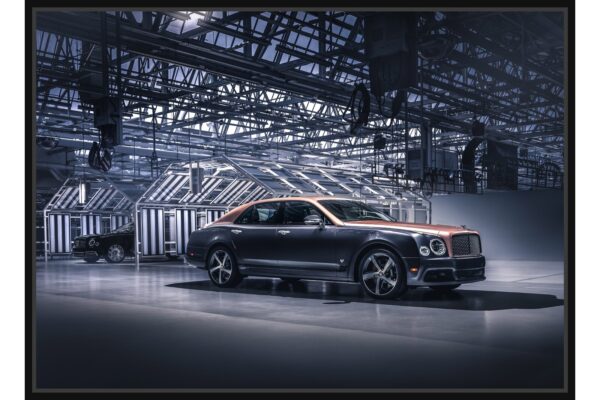 Сив Bentley с оранжеви детайли в индустриален интериор.
