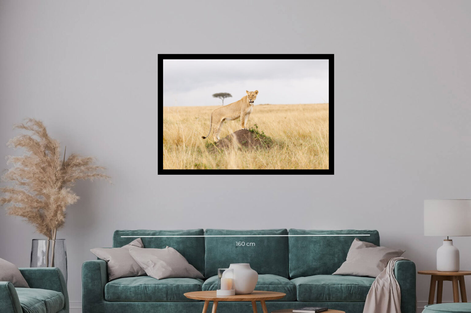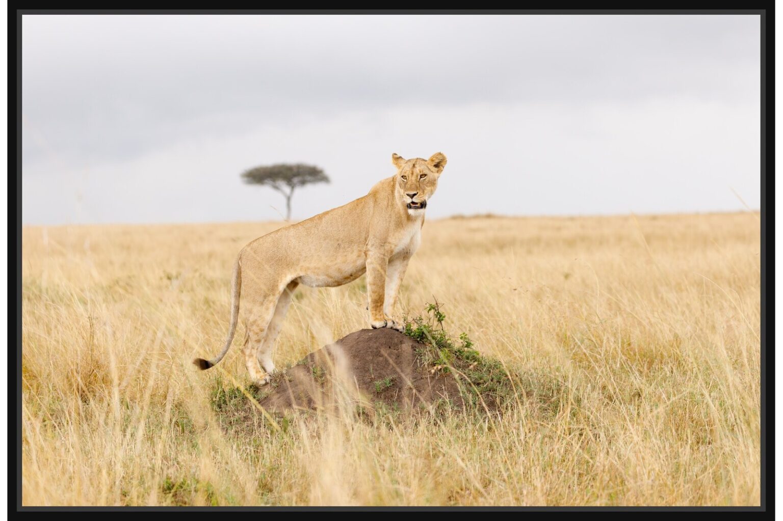 Елегантна фотография на лъвица върху скала, изправена сред златните треви. Детайлният кадър подчертава грацията и силата на животното в естествената му среда.