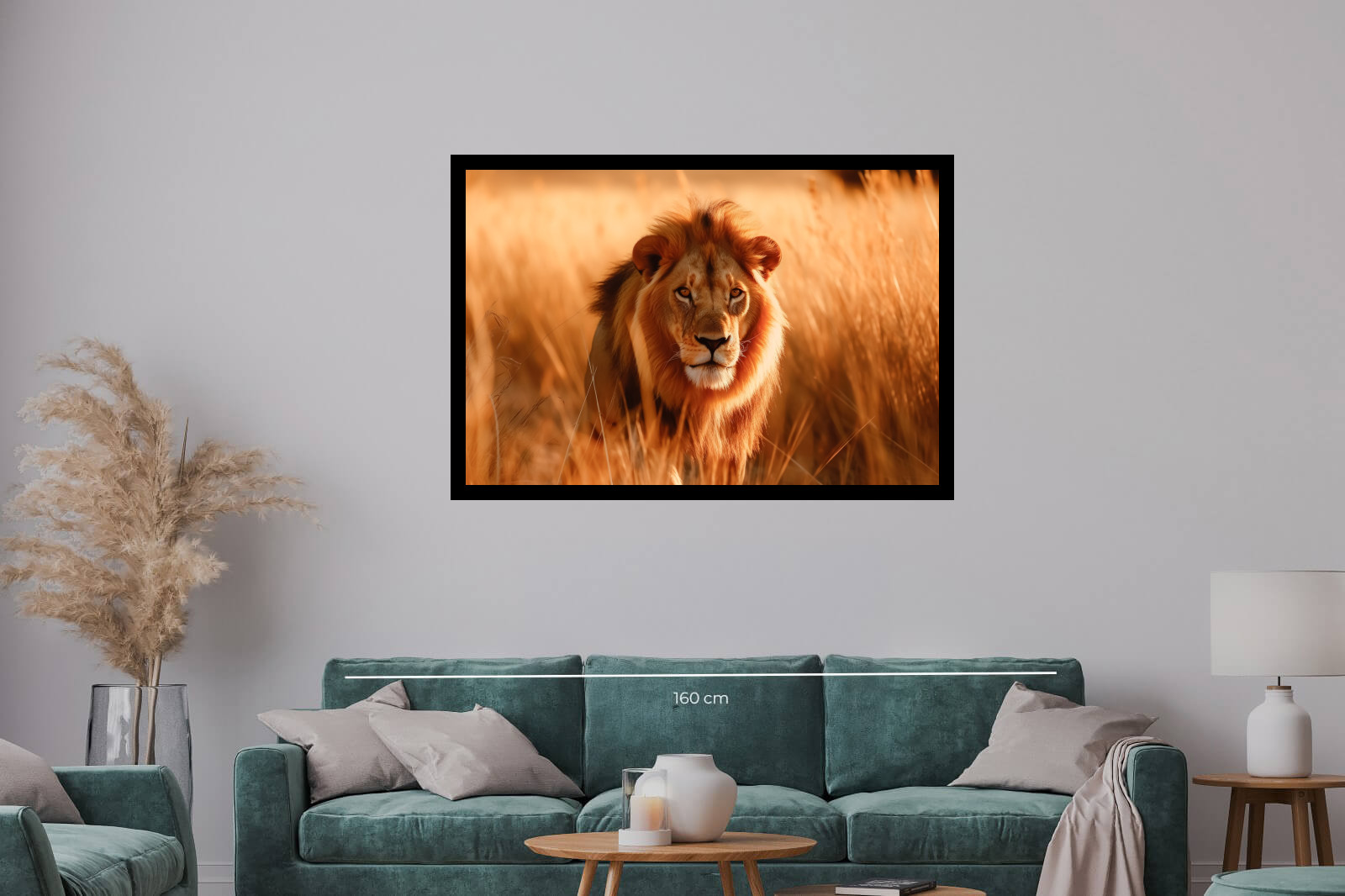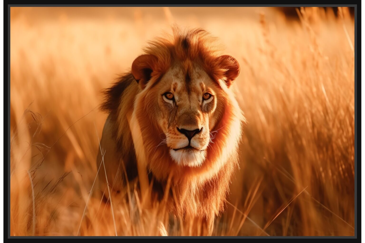 Въздействаща фотография на лъв, осветен от топлата светлина на залеза. Интензивният поглед и огненият оттенък на гривата подчертават силата и благородството на животното.