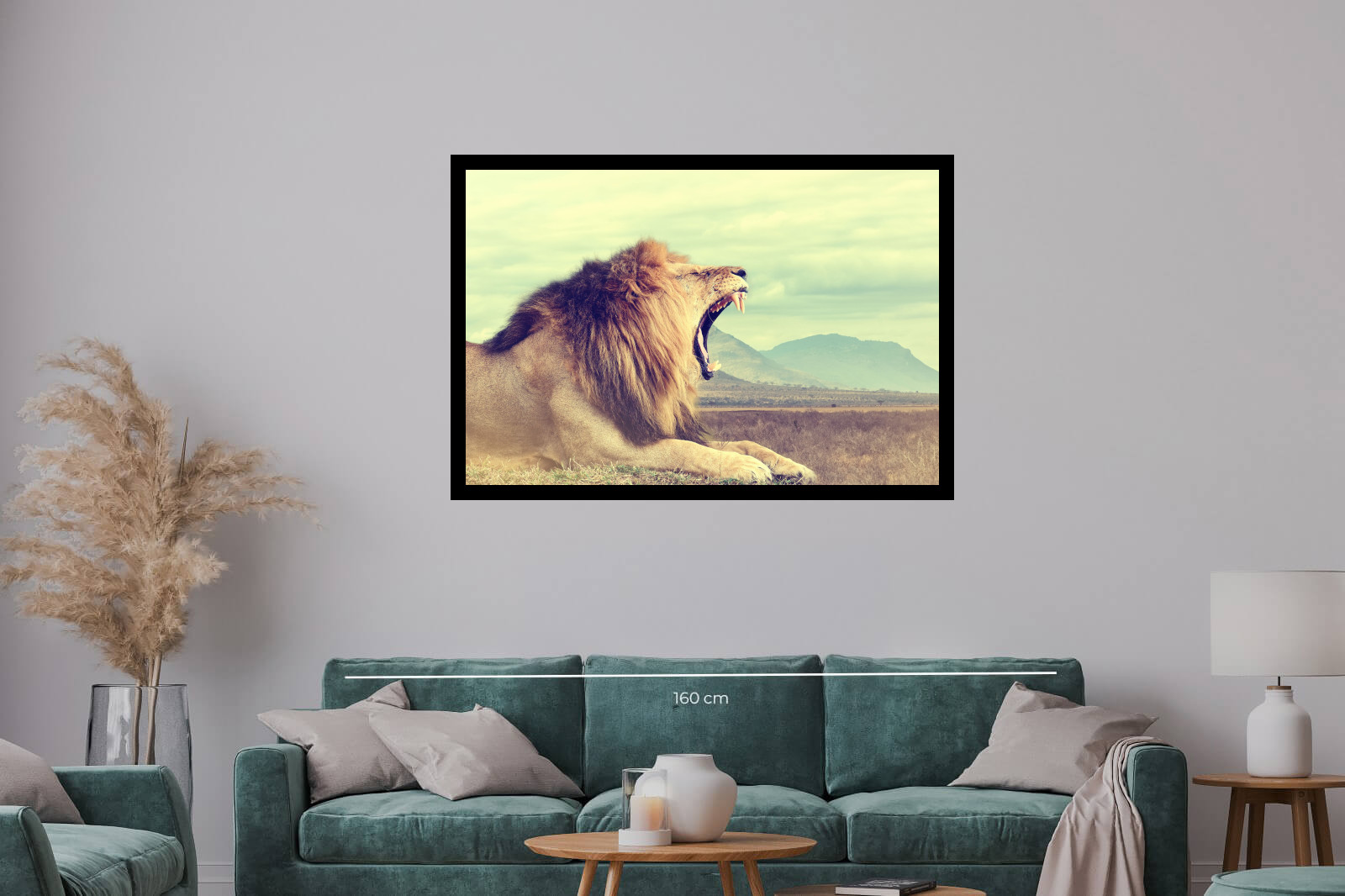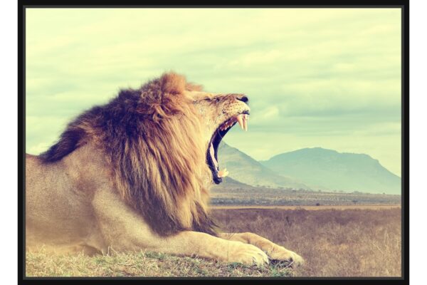 Величествена фотография на лъв, улавящ момент на прозяване сред саваната с планини на заден фон. Контрастът между суровия пейзаж и силата на животното придава драматизъм и автентичност на кадъра. Снимката внушава величие и спокойна мощ.