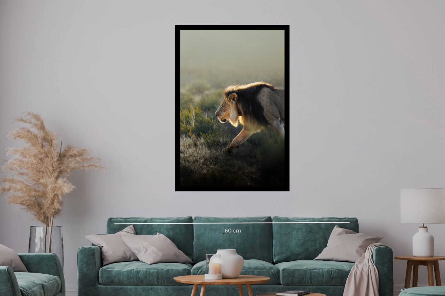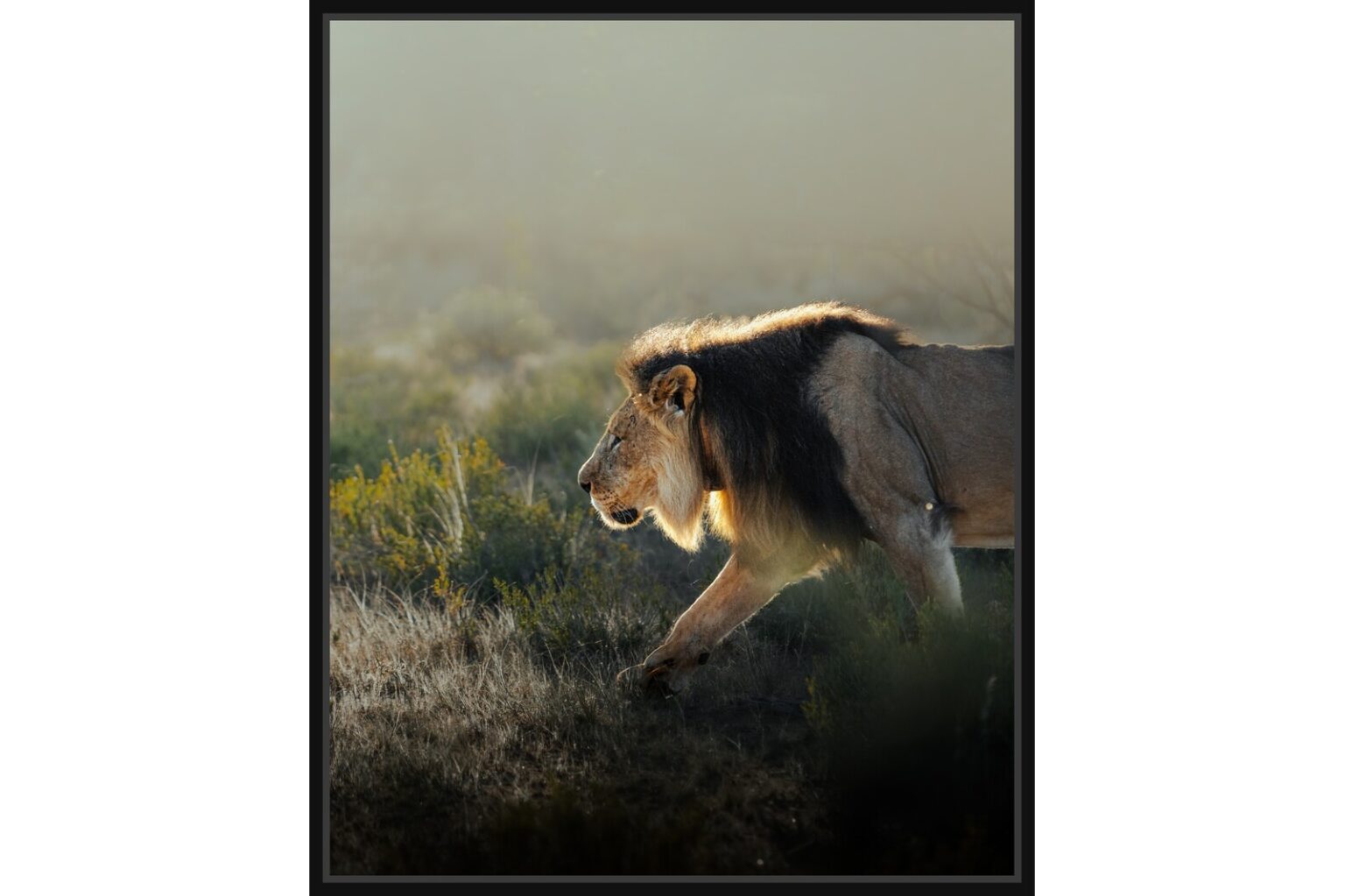 Внушителна фотография на лъв в движение, обгърнат от меката светлина на здрача. Атмосферата носи усещане за сила и тайна в дивата природа.