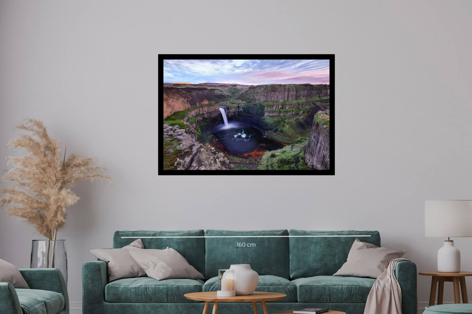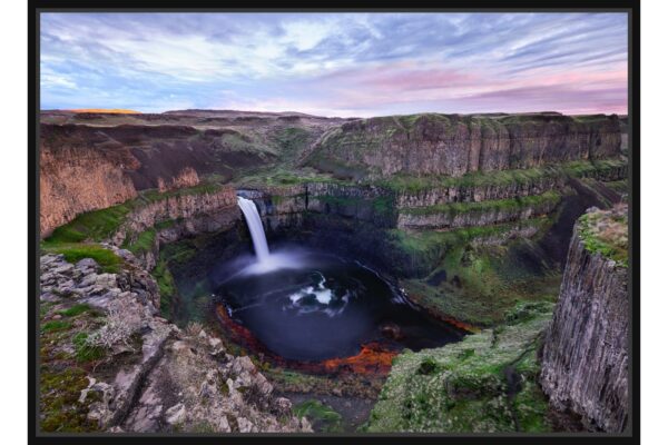 Внушителен водопад, който пада в дълбок каньон, обграден от скали и зеленина. Небето в нежни цветове подсилва драматичната, но хармонична атмосфера на пейзажа.