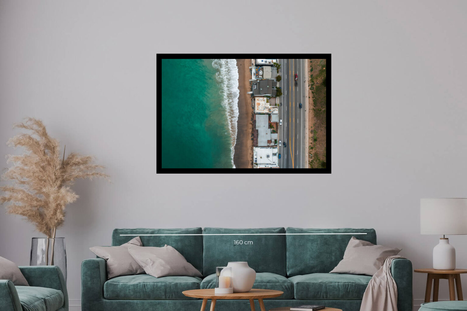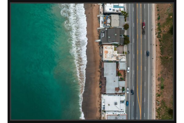Въздушна фотография на Малибу, където вълните на Тихия океан срещат редицата от къщи, разположени на самия бряг. Контрастът между зеленото на водата и урбанизираната линия на крайбрежието подчертава хармонията между природа и човешко присъствие.