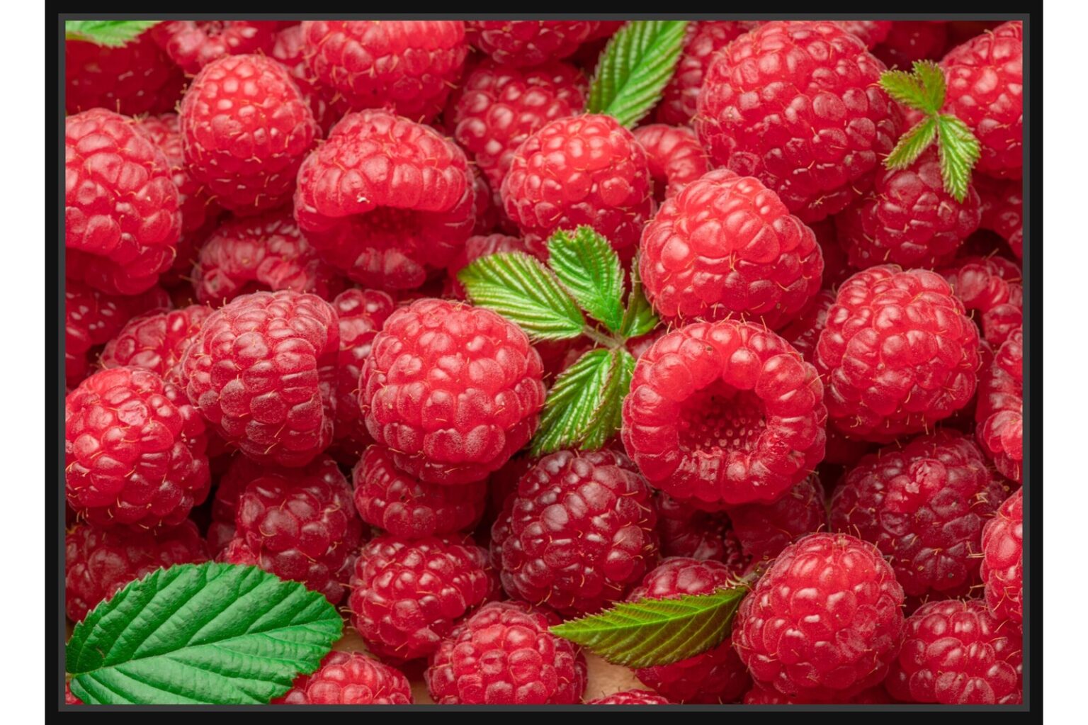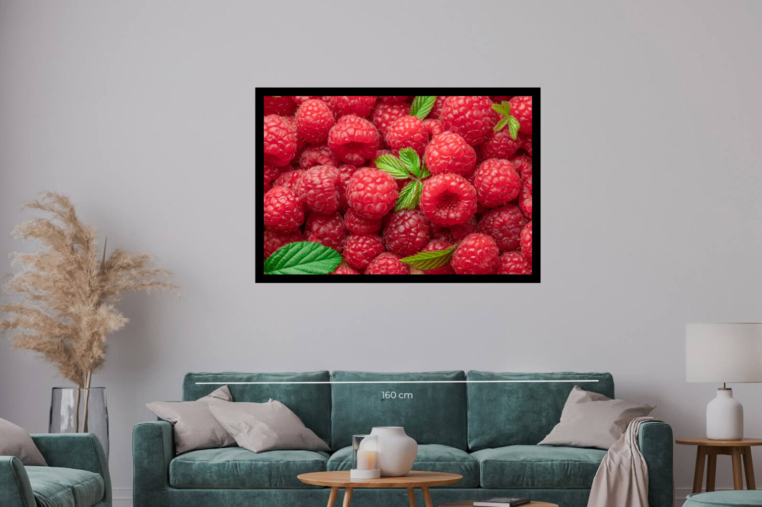 Крупен план на сочни малини с наситен червен цвят, гарнирани със зелени листа. Фотографията внушава свежест и натуралност.