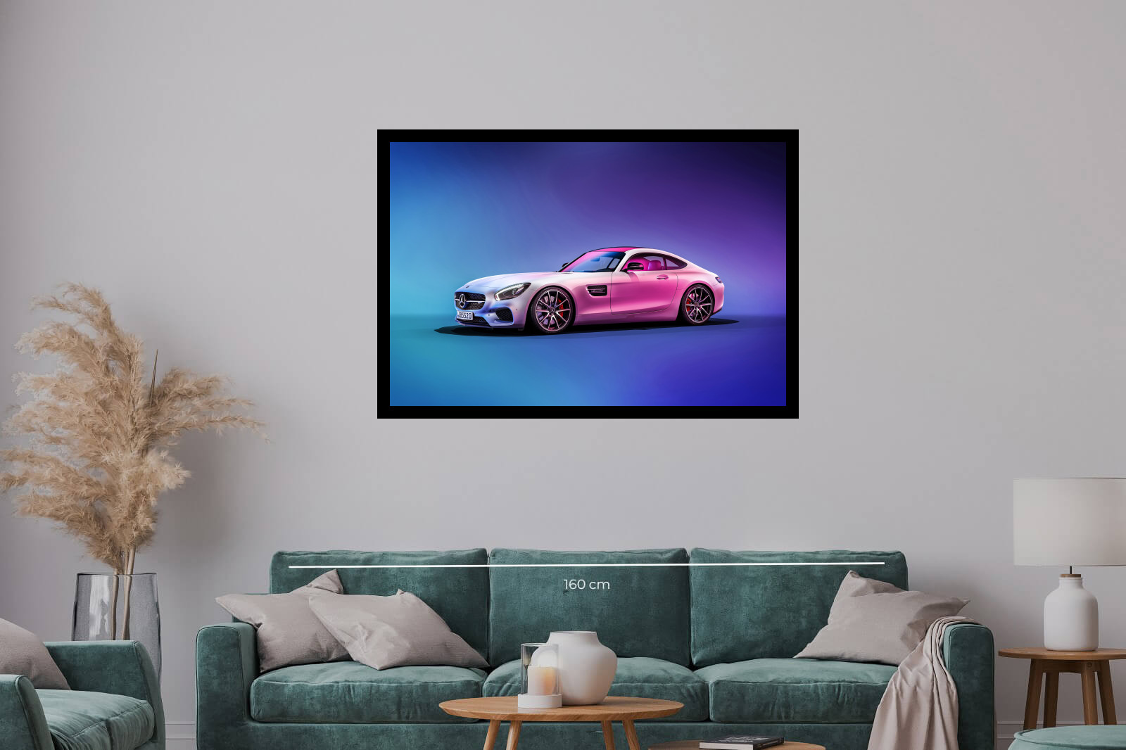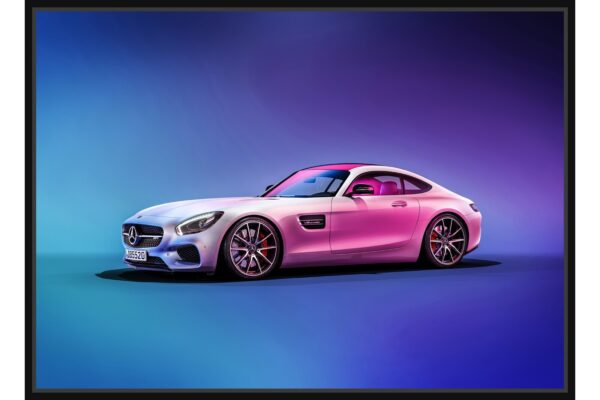 Съвременна фотография на Mercedes-AMG в студио с неонова пурпурно-синя светлина. Снимката съчетава лукс, модерност и артистична визия.