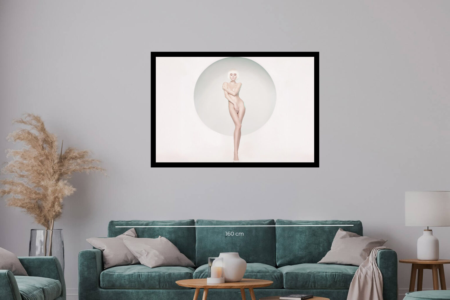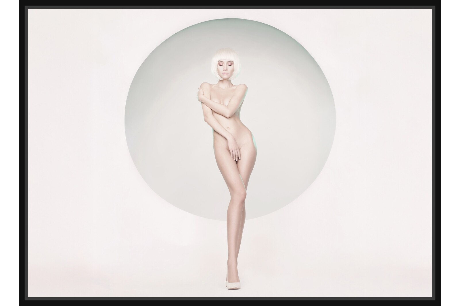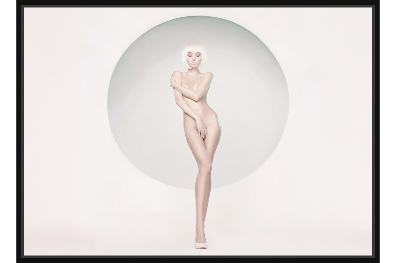 Художествена фотография на жена с къса руса перука, стояща в изчистен бял кръг. Силуетът и позата ѝ внушават усещане за елегантност и модерна минималистична естетика.
