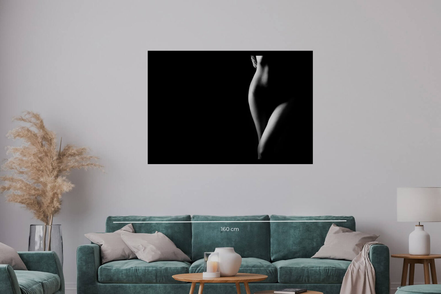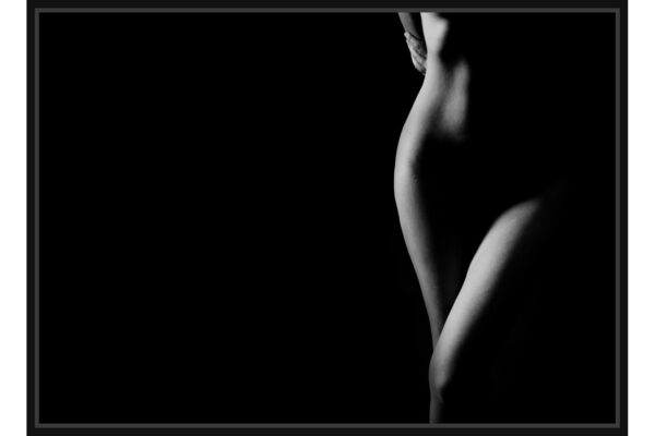 Художествена фотография в черно-бяло, представяща минималистичен женски силует в деликатна светлина. Изображението акцентира върху формите и контрастите, създавайки усещане за загадъчност и елегантност.