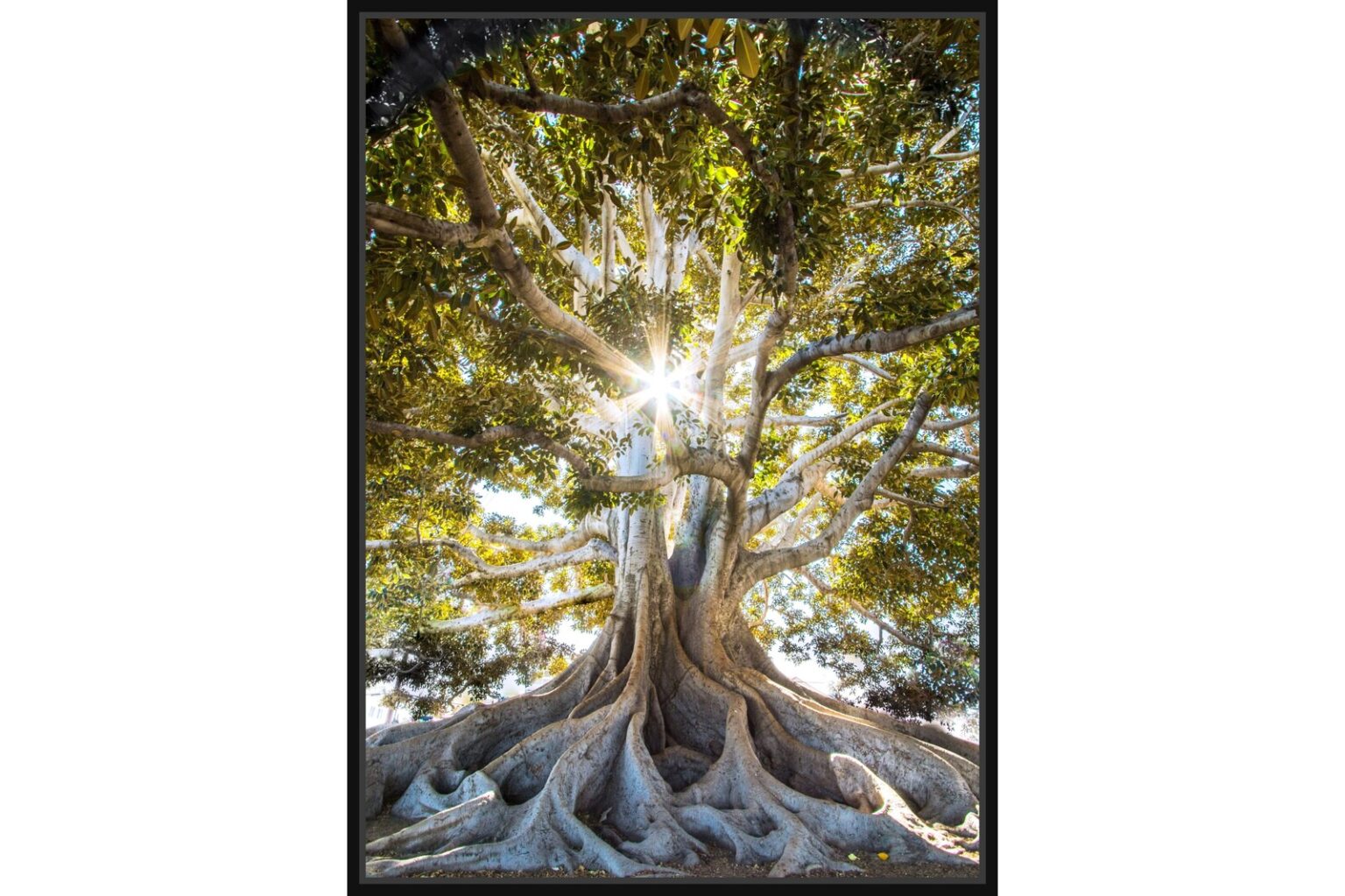 Внушително дърво с огромни клони и корени, през които пробива светлината на слънцето. Символ на сила, устойчивост и връзка с природата.