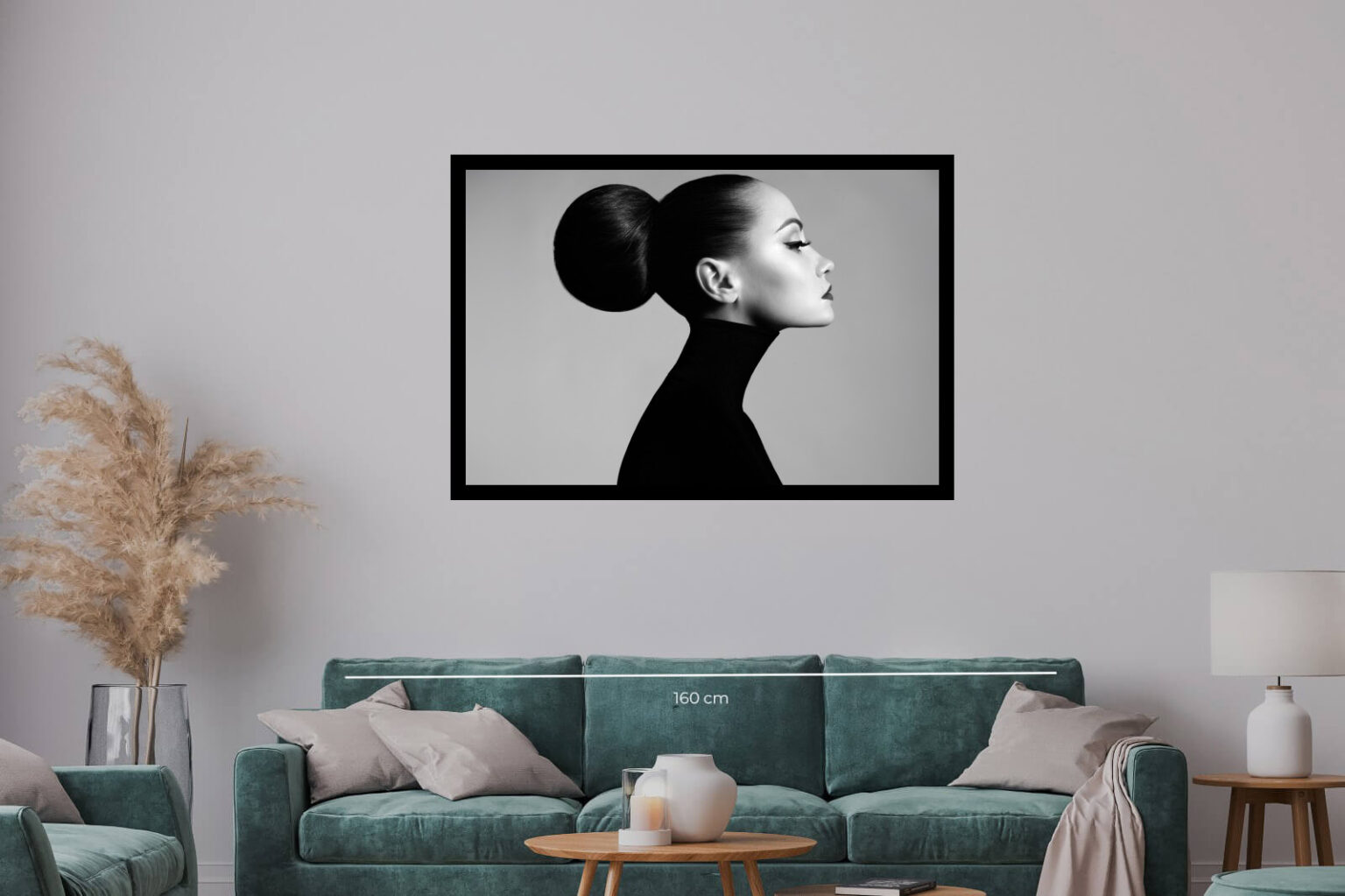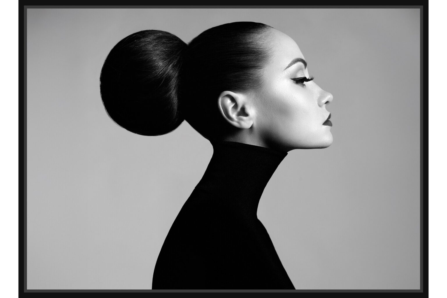 Силуетен профил на жена в черно-бял стил, облечена в дреха с висока яка. Подчертаните черти и високият кок в косата придават елегантност и изтънченост.