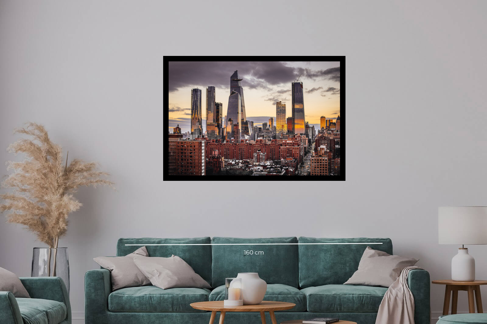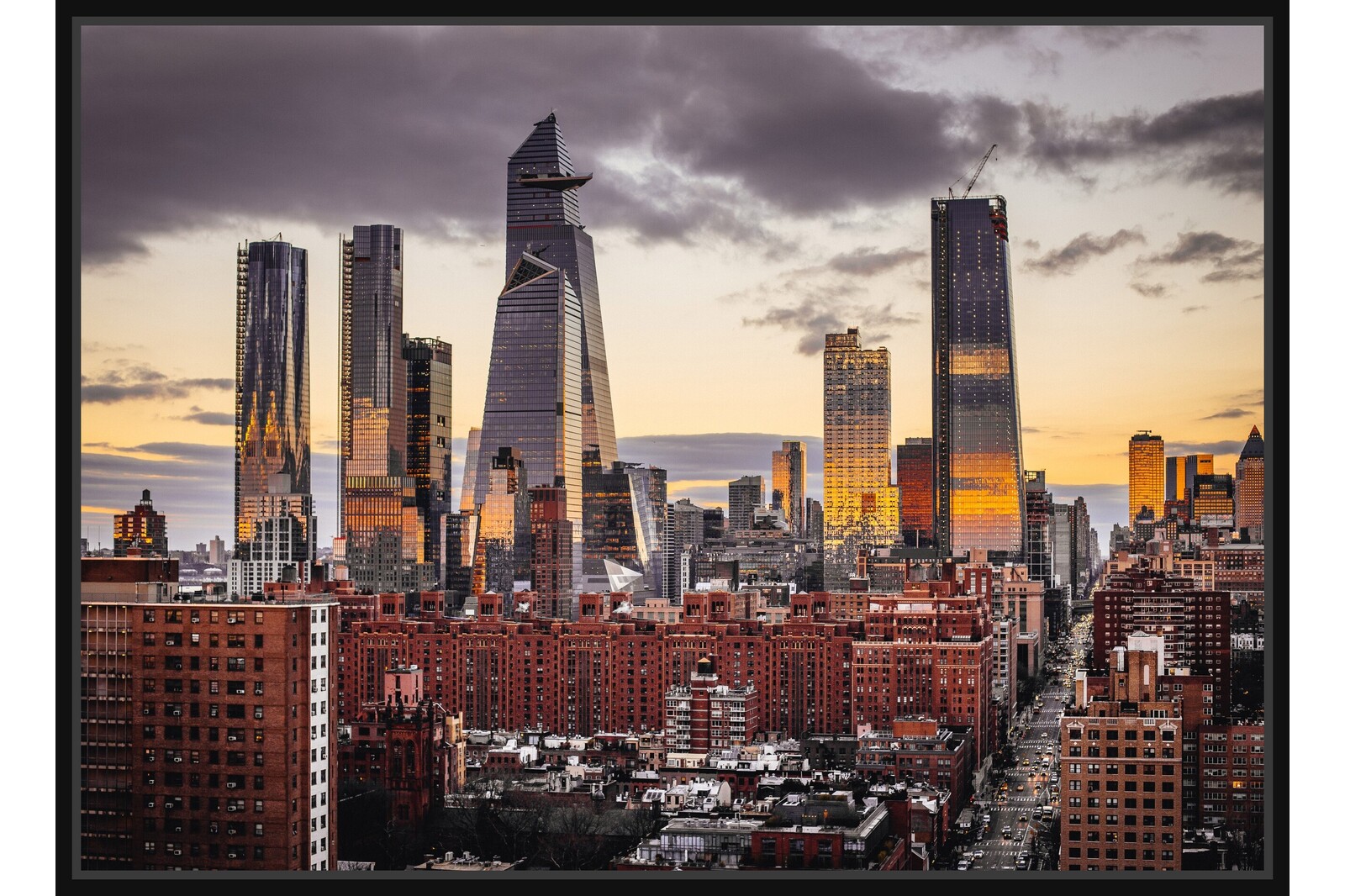 Панорама на квартал в Ню Йорк с модерни небостъргачи, сред които се открояват Hudson Yards. Залезът добавя топли нюанси върху фасадите.