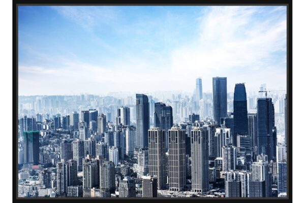Панорамна фотография на съвременен град с впечатляващи небостъргачи, извисяващи се под ярко синьо небе. Кадърът разкрива динамиката и енергията на модерния метрополис.