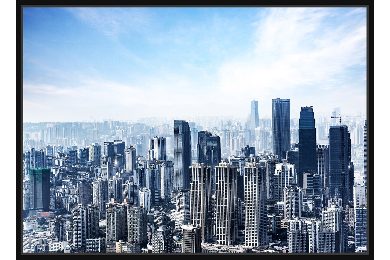 Панорамна фотография на модерен град с небостъргачи и синьо небе