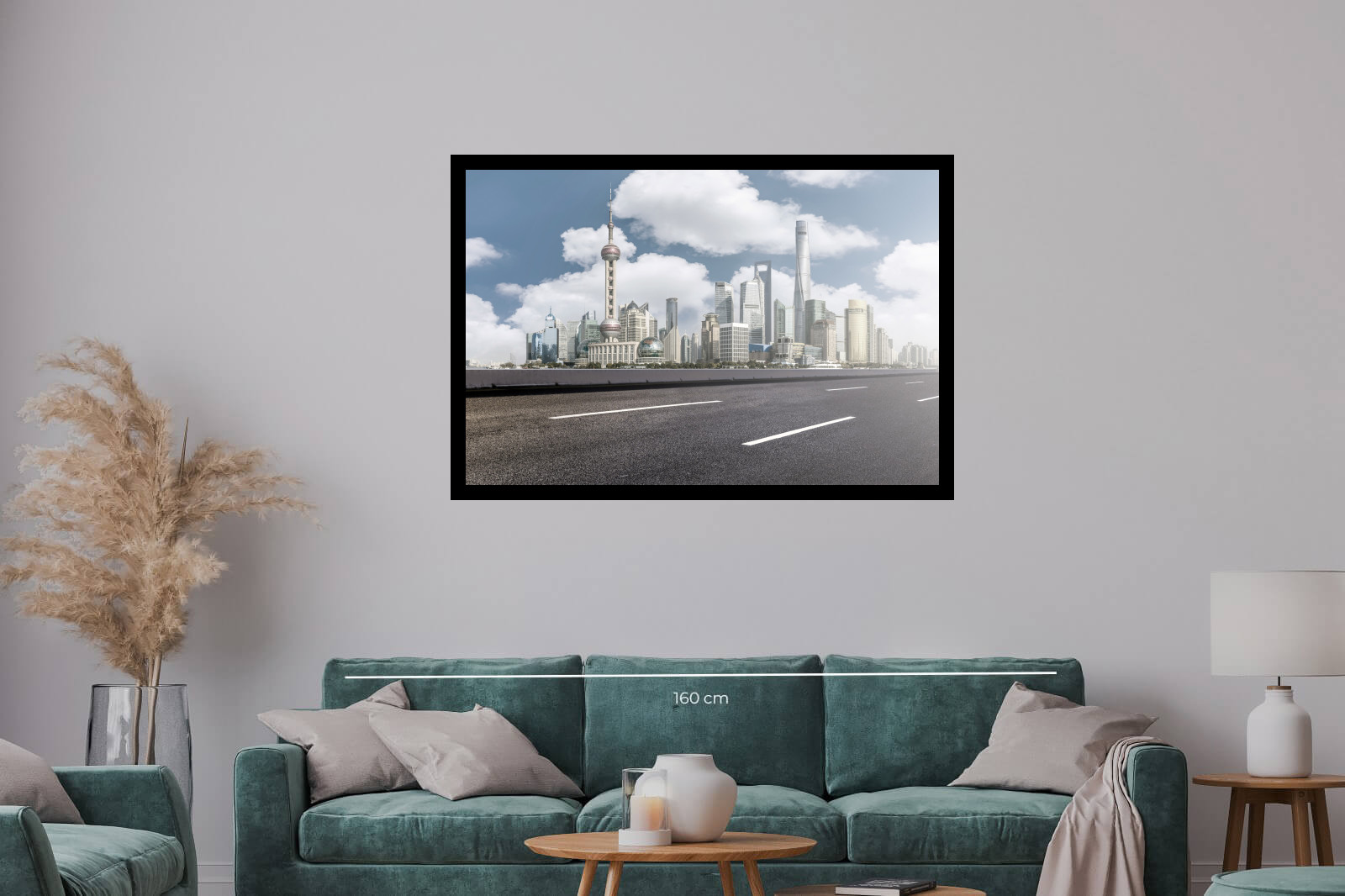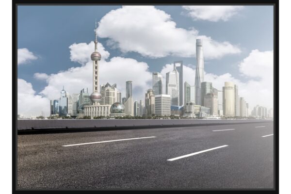 Панорамна фотография на модерния силует на Шанхай с емблематичната Oriental Pearl Tower и небостъргачите в Пудонг. Кадърът подчертава динамиката на икономическия център на Китай и съчетава архитектурна мощ с усещане за бъдеще.