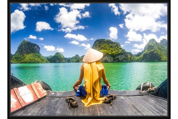 Символична сцена с монах, седнал на лодка и гледащ към зелените скали и спокойните води на Халонг Бей. Атмосфера на медитация и хармония.